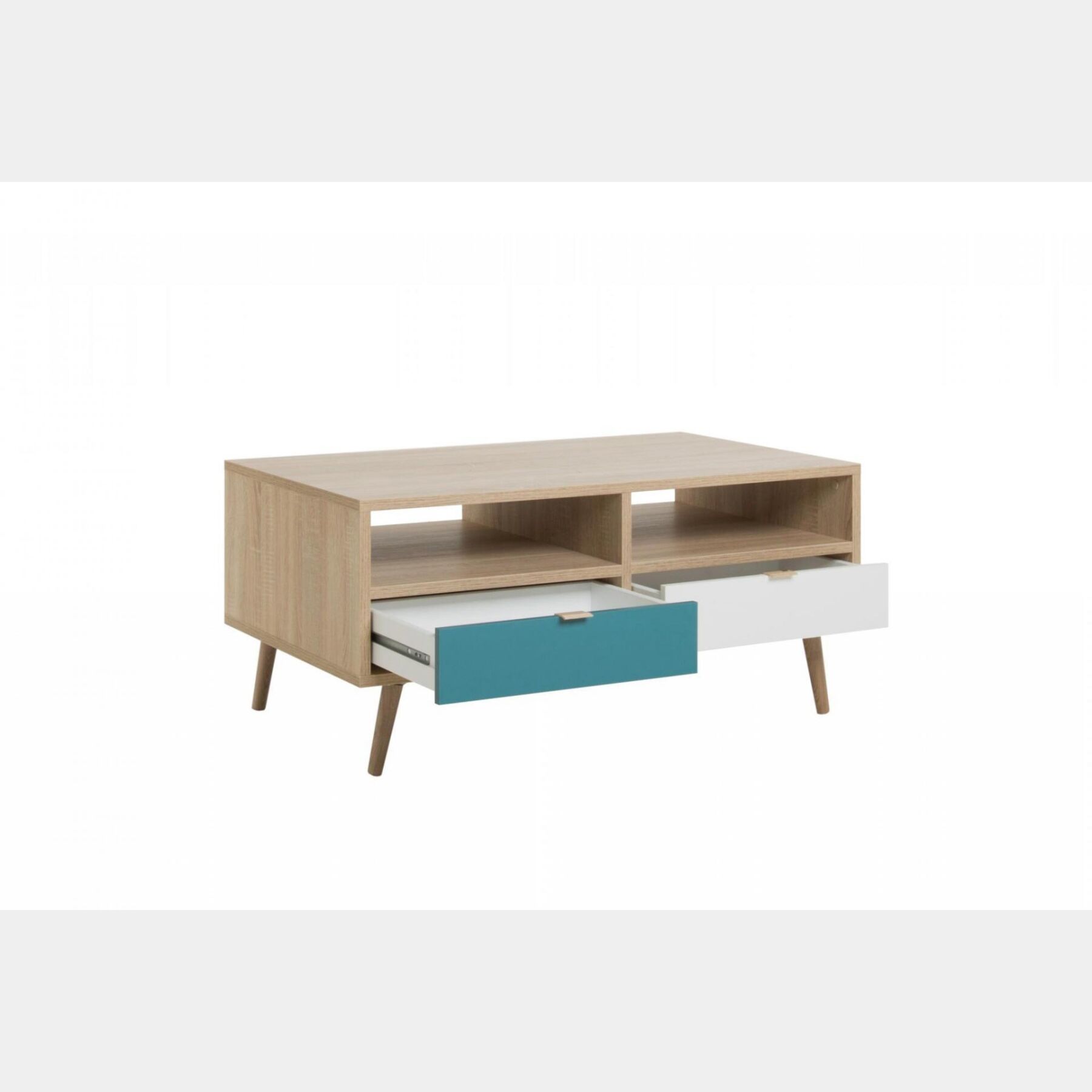 Tavolino di design con gambe in legno, 2 cassetti e 2 vani a giorno, finitura Quercia, Bianca, Petrolio e Grigio, la struttura è in melaminico. Progettato per donare nuove e antiche emozioni, si adatta con rara sobrietà alla casa moderna. Uno stile nordico ricercato e di qualità.