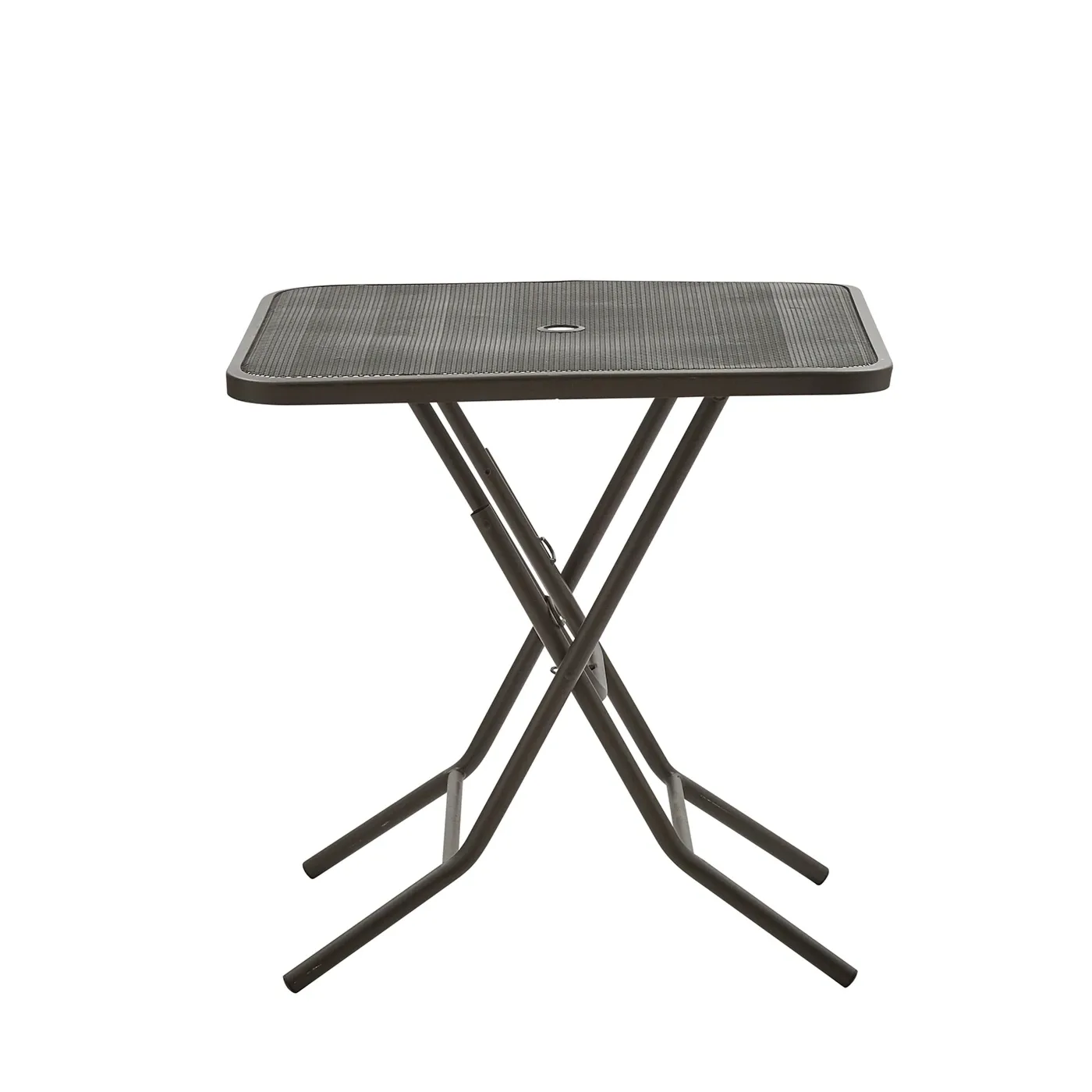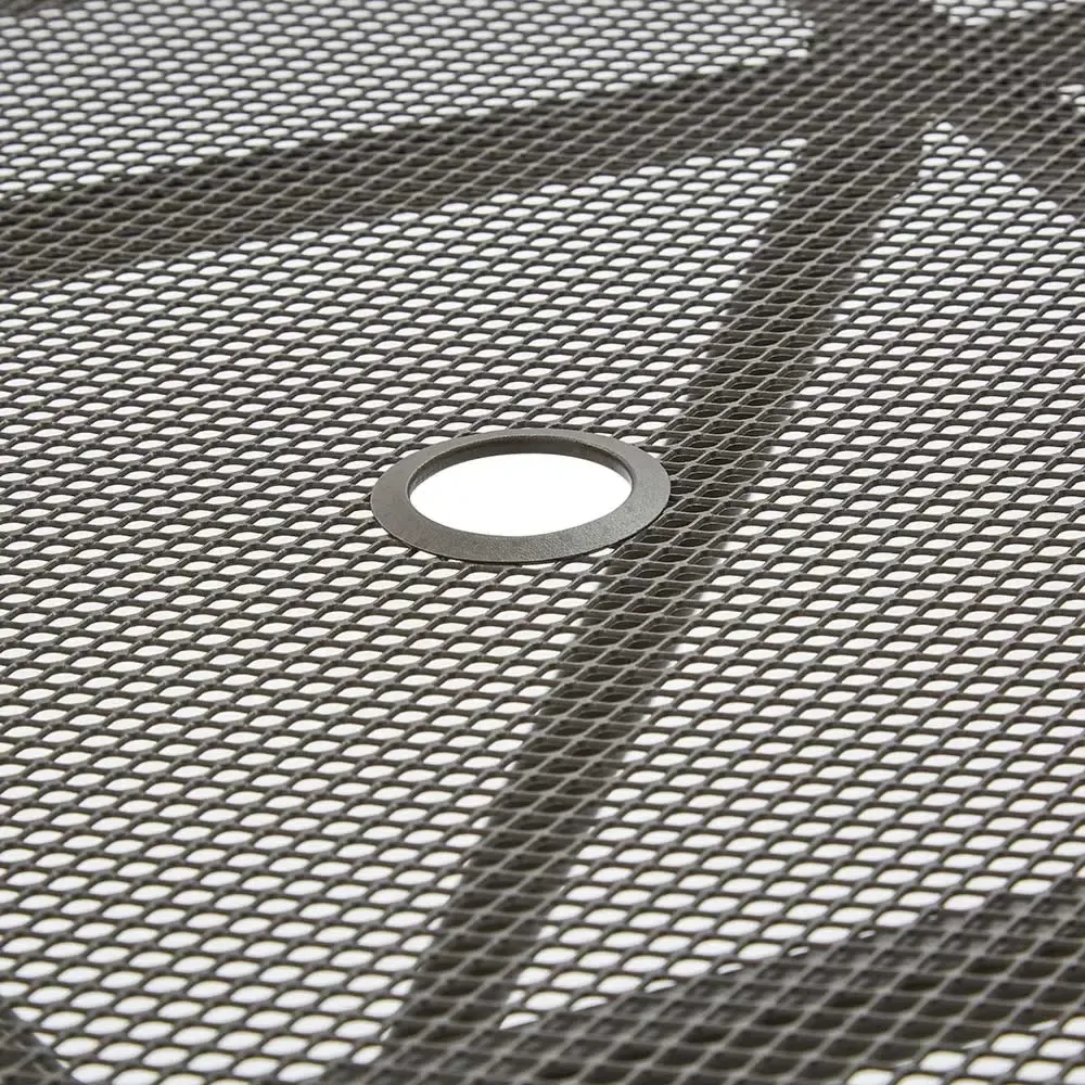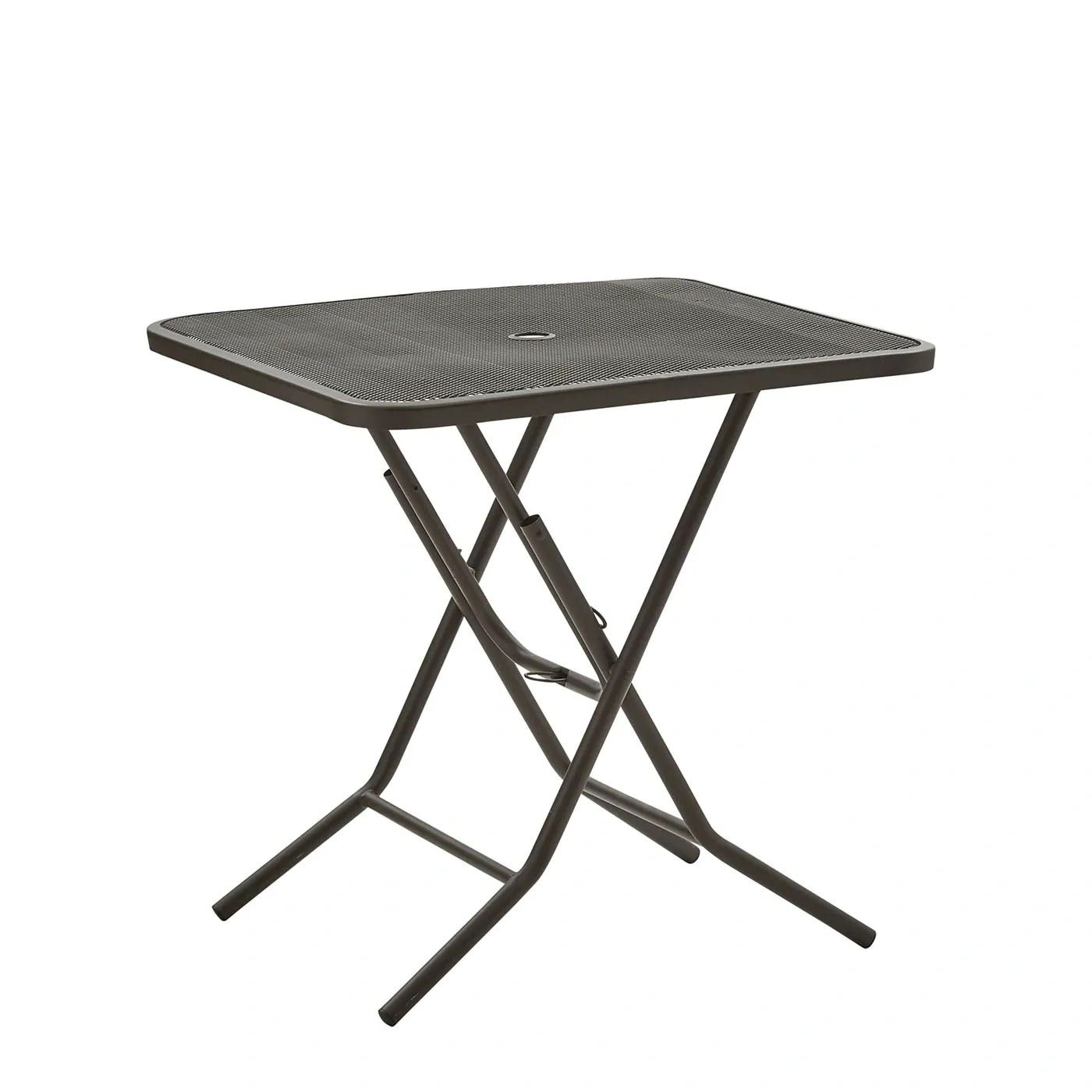 Tavolino in metallo con foro centrale ideale per arredare il giardino o una zona porticata e abbinabile ad un set di sedie del medesimo colore per creare un set da giardino di notevole eleganza. Resistente e allo stesso tempo elegante.