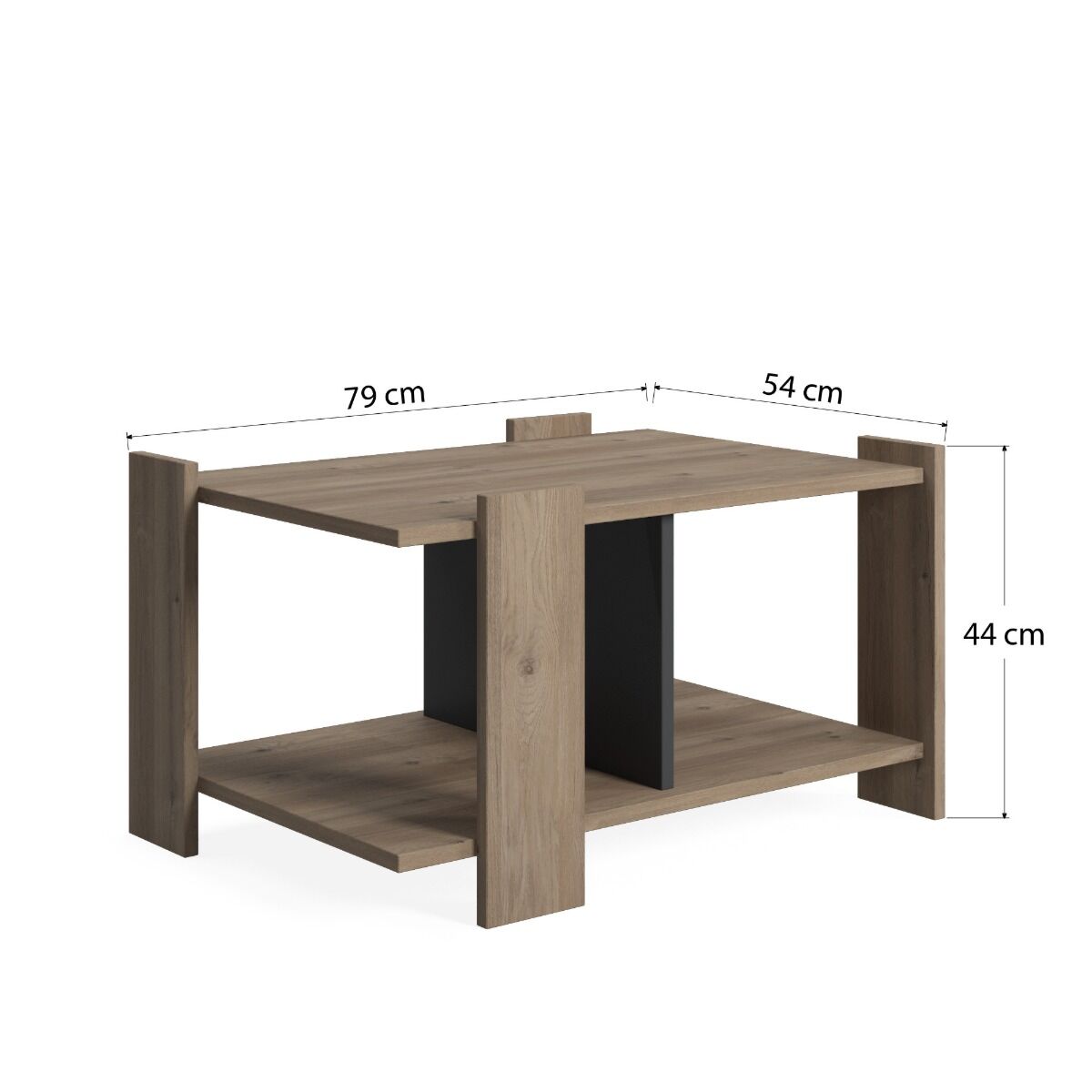 Il tavolino è dotato di 2 ripiani nella finitura Rovere, così come le gambe, e di un elemento divisiorio centrale posto verticalmente che crea 2 vani a giorno. Le venature della finitura in Rovere sono uniche e personalizzano il tavolino, consentendo una perfetta adattabilità a tutti gli stili.