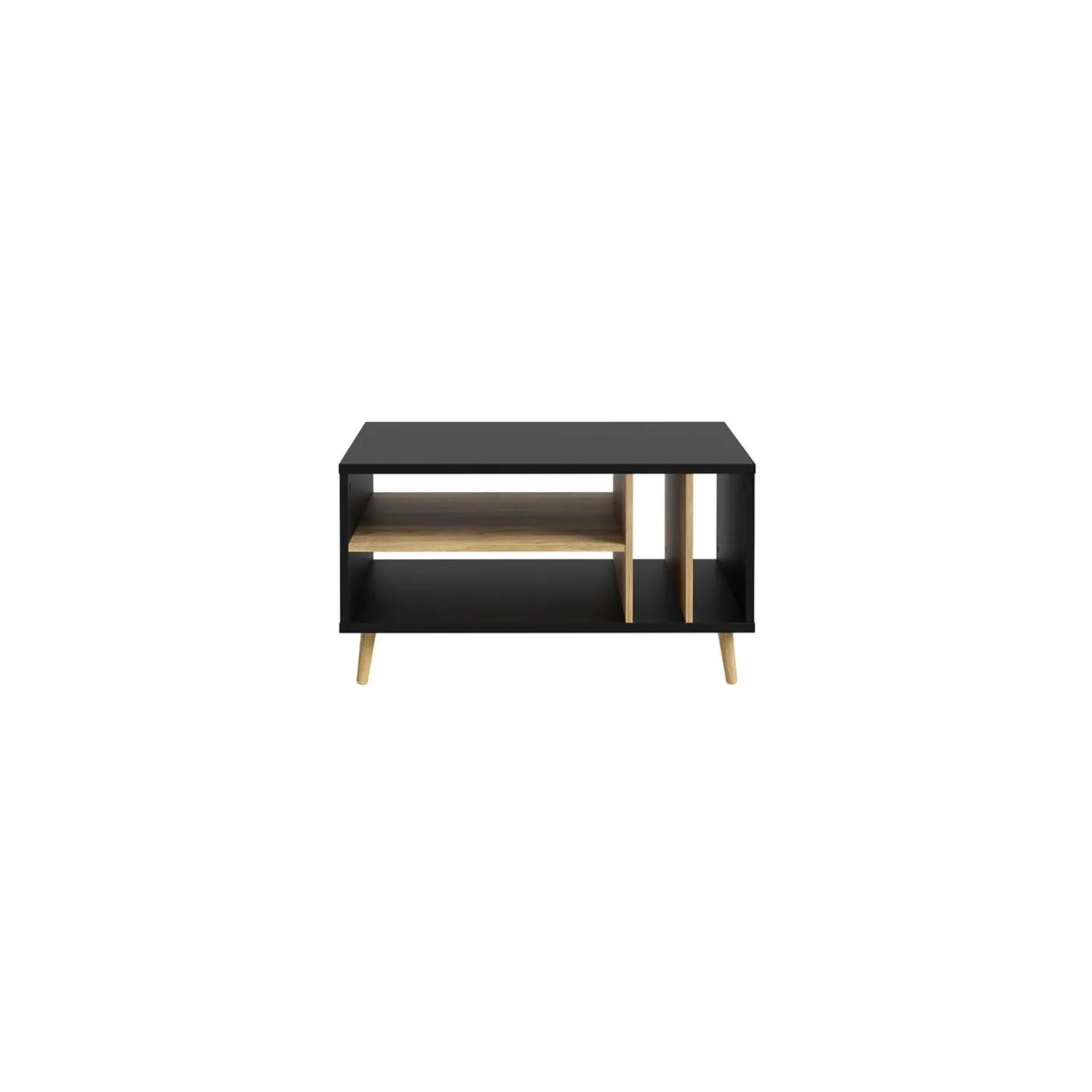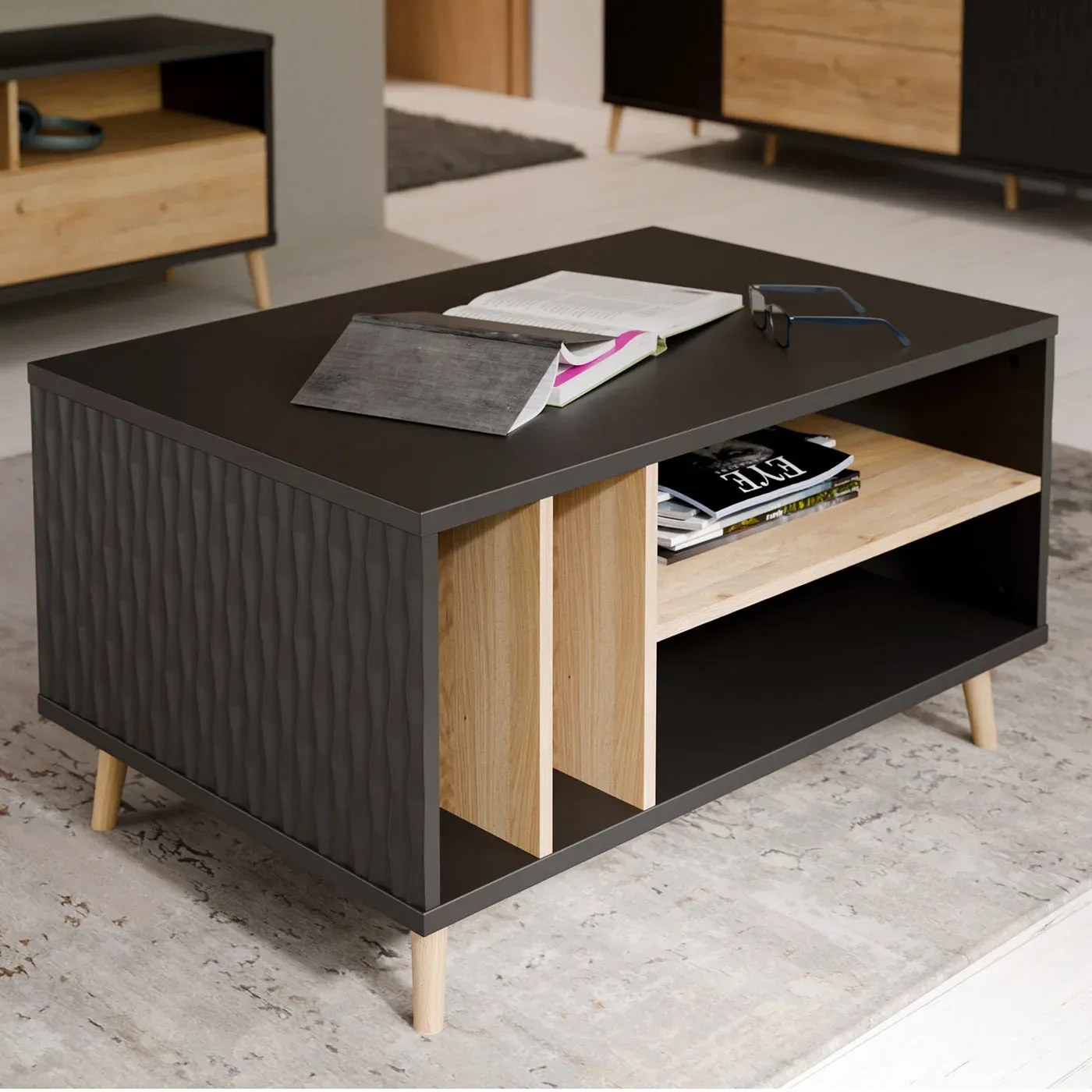 Lo stile del tavolino e le finiture tipiche, Rovere e Nero, si fondono per dare vita ad un netto contrasto che cattura l'attenzione. Il tavolino presenta un due divisori verticali e uno orrizontale che creano 4 vani a giorno.