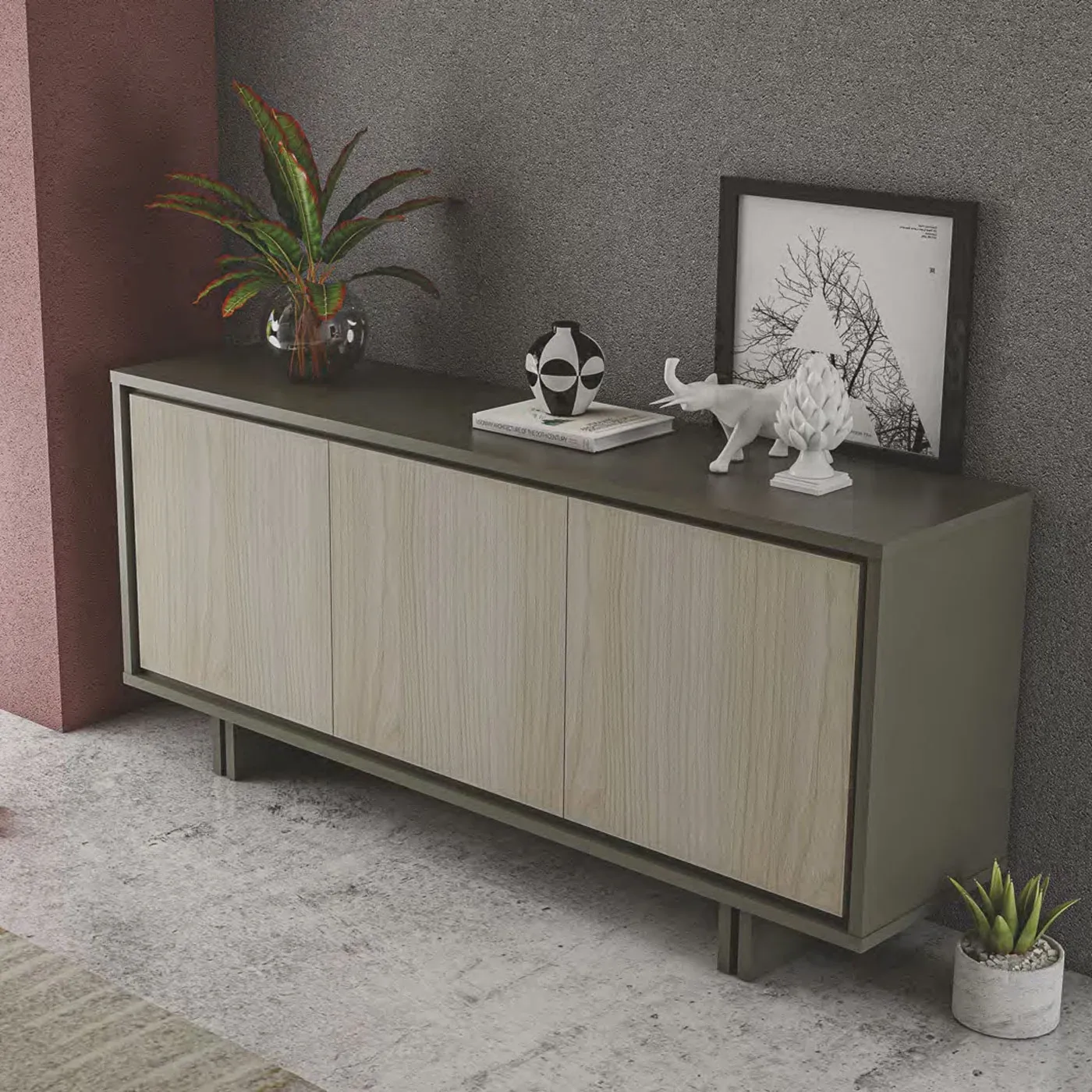 Nuova madia costituita da tre ante finiture color Fango e Olmo perla. E' perfetto per dare un tocco di modernità alla vostra zona living. Come si può notare dalle foto, il suo design è semplice, pulito e ordinato. Al suo interno è molto spaziosa per riporre numerosi oggetti. E' un Mobile da soggiorno che garantisce resistenza, comodità e durevolezza nel tempo.E' caratterizzato da piedistalli in finitura Legno.