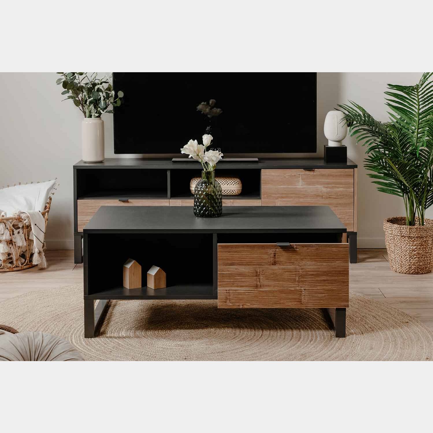 Il tavolino per soggiorno si contraddistingue grazie all'accostamento di due colorazioni: la struttura in finitura antracite con il cassetto effetto Bamboo. L'abbinamento dei due colori, ricercati con grande cura, richiama lo stile nordico della collezione ma allo stesso tempo regala all'ambiente un tocco dello stile industry, ideale per soggiorni in questo stile. La struttura è rialzata da terra in virtù dei due piedini antracite uniti tra loro in profondità, garantendo così un solido supporto.