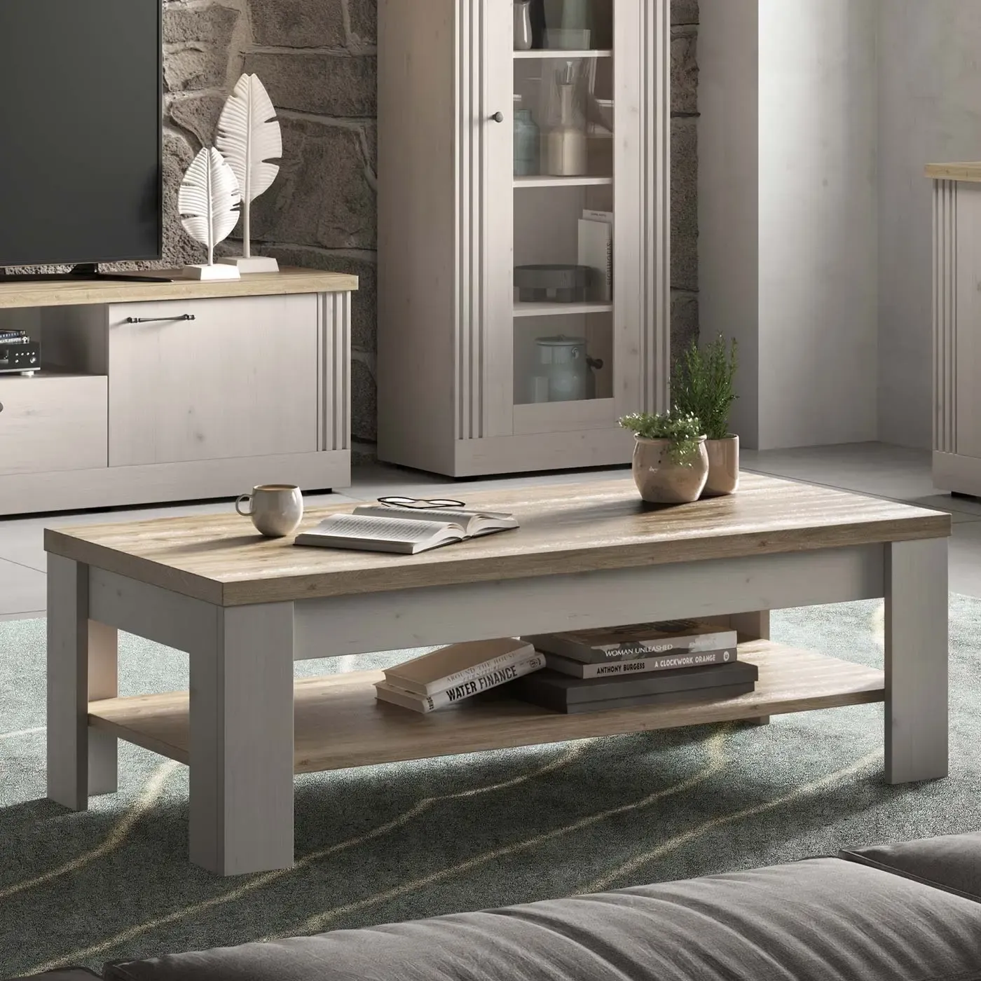 Le finiture Rovere meringa e Cadiz creano luce e armonia, assicurando al living calore e carattere. Della stessa collezione è possibile trovare madie di diverse dimensioni, porta tv, vetrine e tavoli, per creare composizioni uniche e personali.