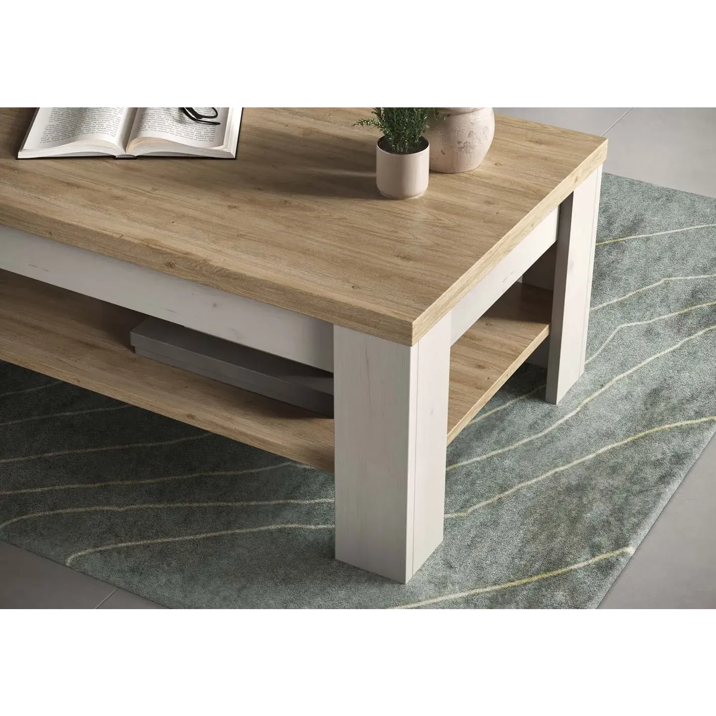 Tavolino per soggiorno bicolore, con ripiano, in promozione. Ideale per compensare l'eventuale mancanza di un mobiletto da salotto da porre fra il divano e la zona TV.