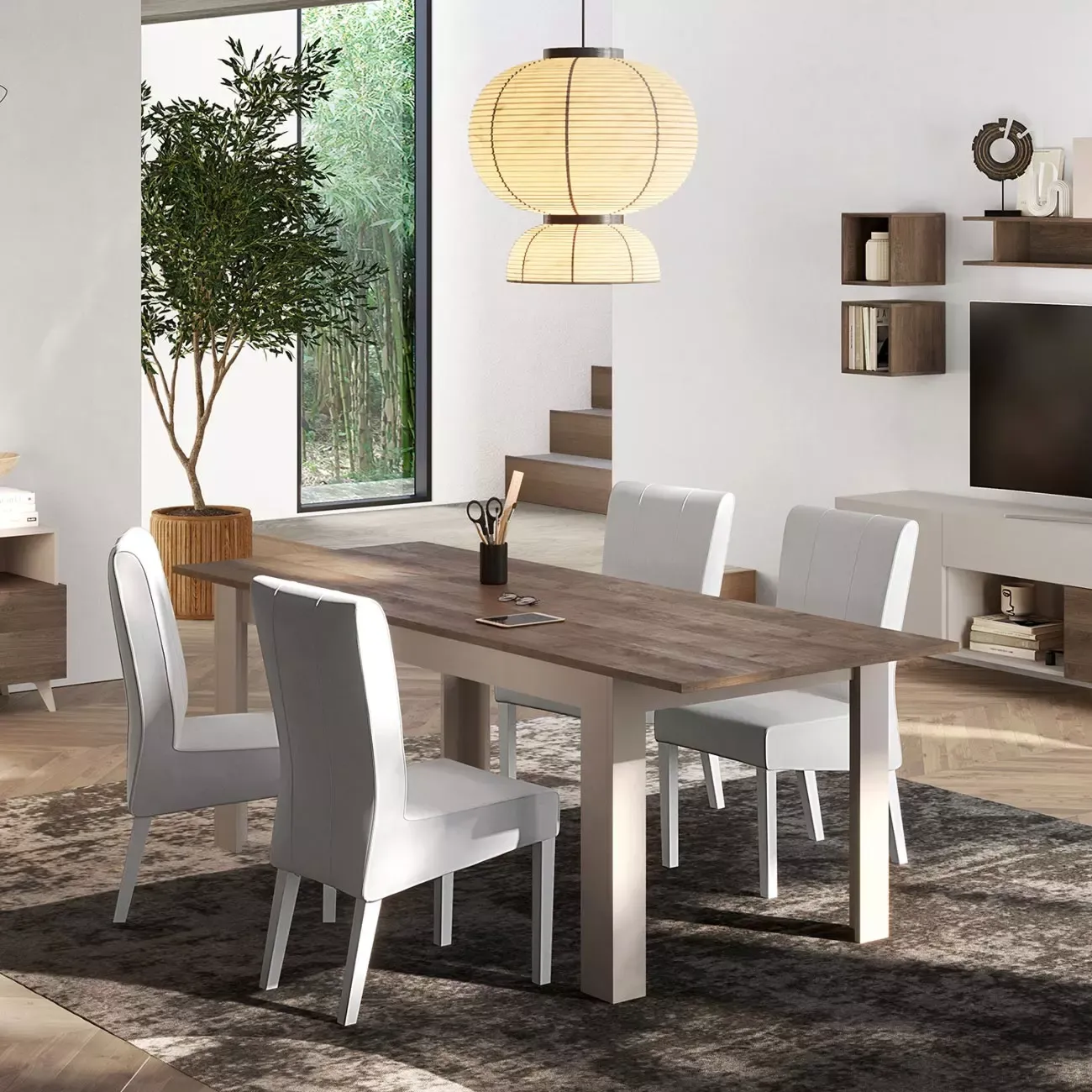 Semplice ma di impatto il tavolo è caratterizzato da finiture a contrasto, il Mercure e il Cashmere, che creano un piacevole impatto, offrendo un arredo elegante e di tendenza.