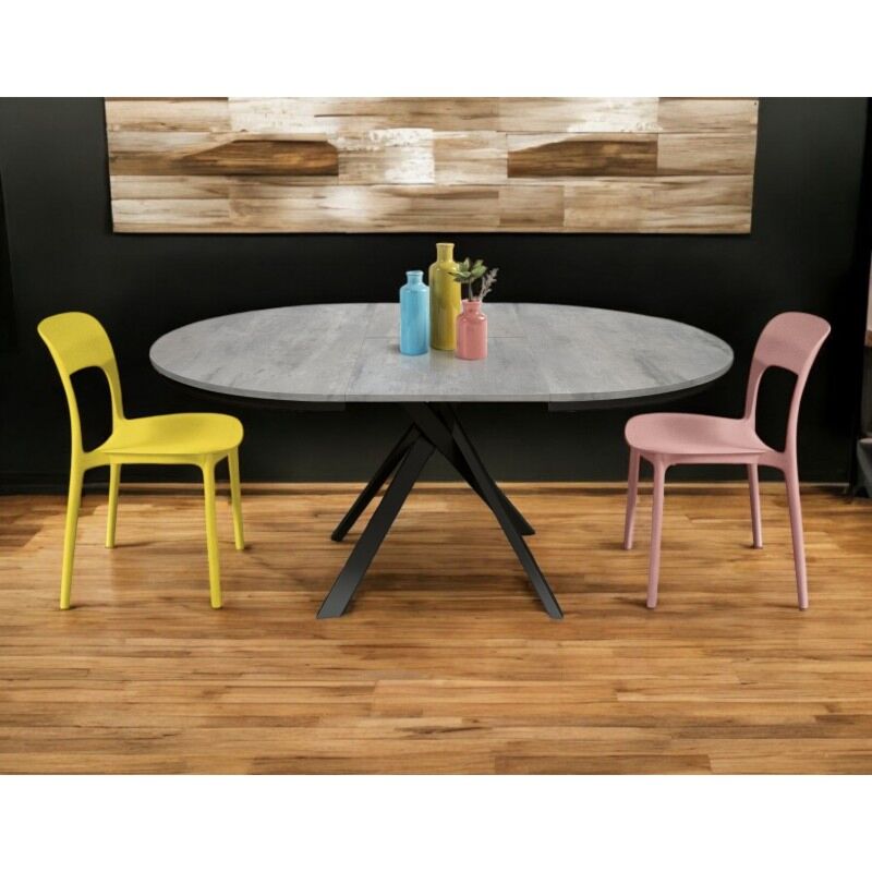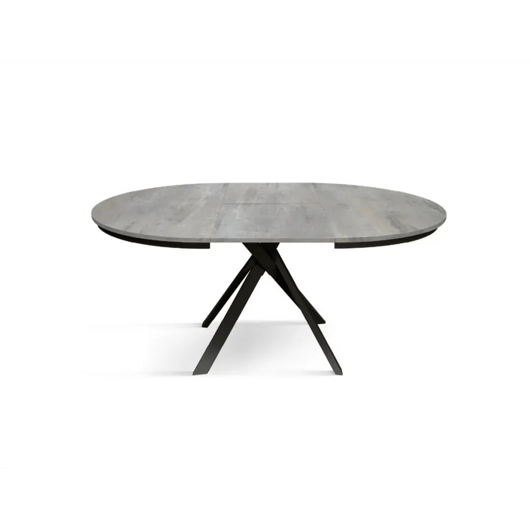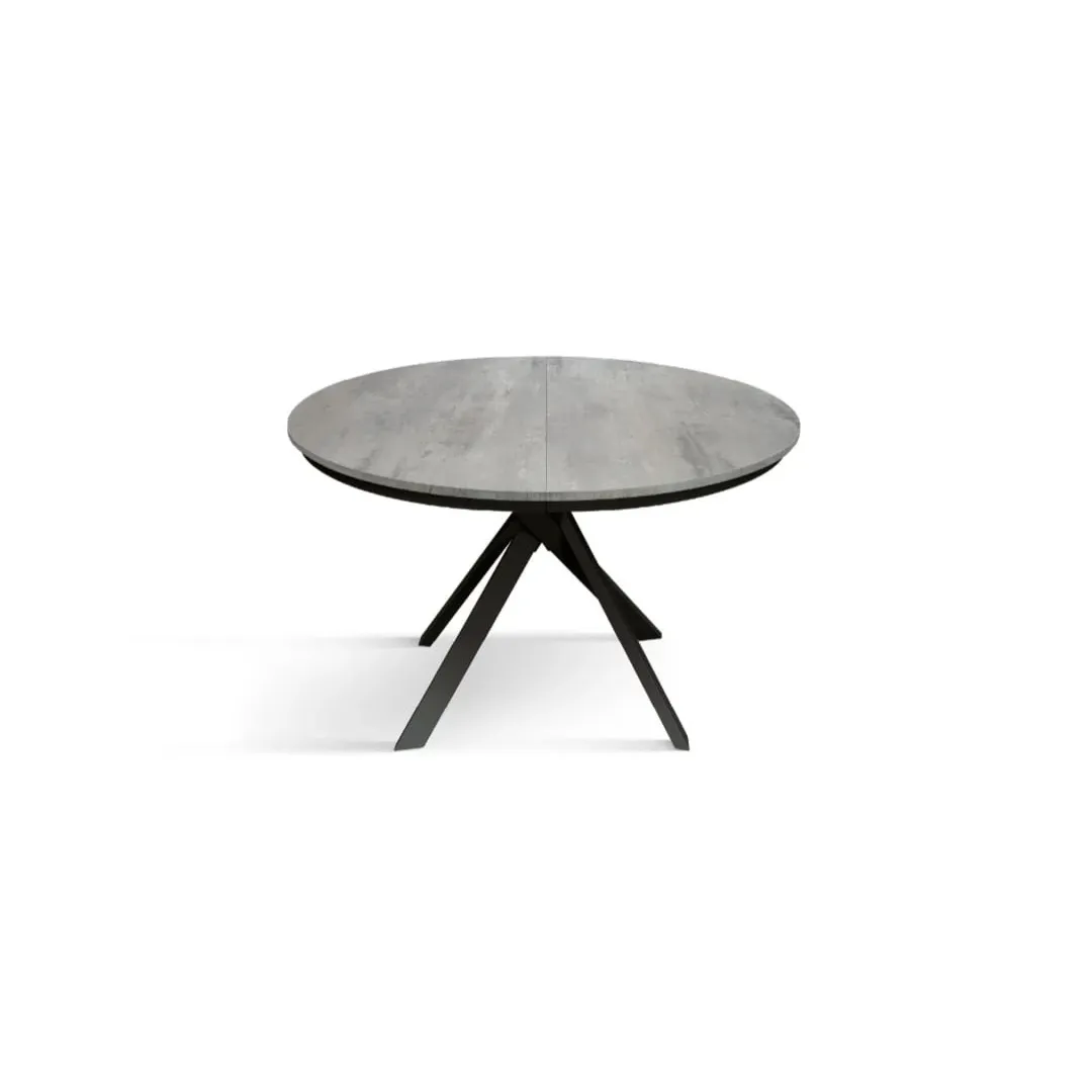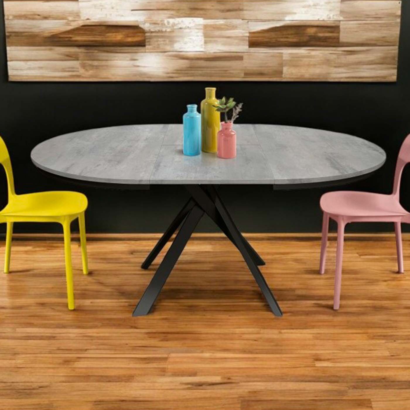 Tavolo allungabile con base in metallo nero e piano rotondo in nobilitato effetto cemento