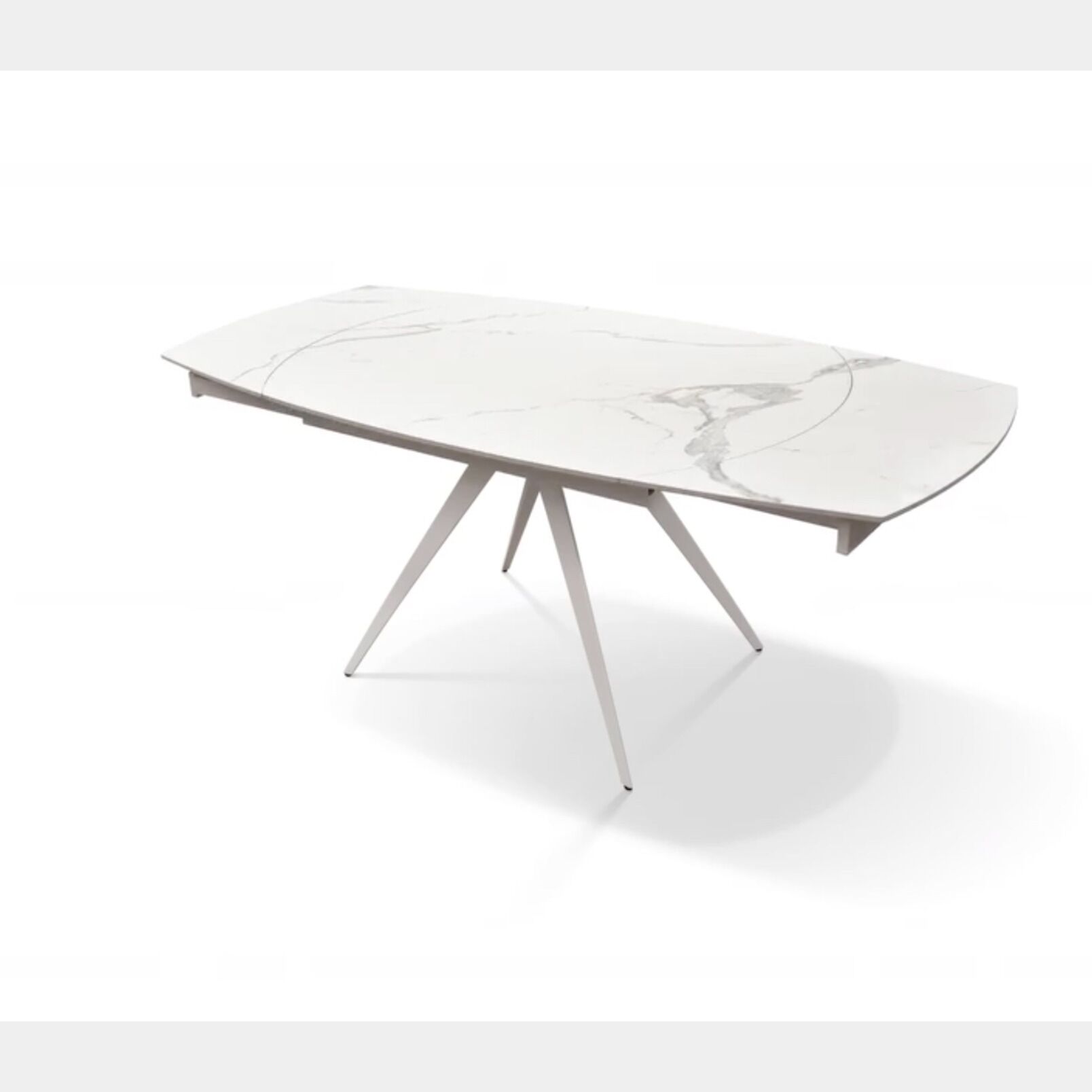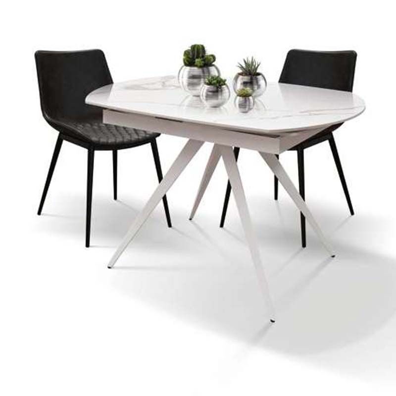 Tavolo allungabile moderno con piano in ceramica lucido arrotondato e con base in metallo colore bianco.