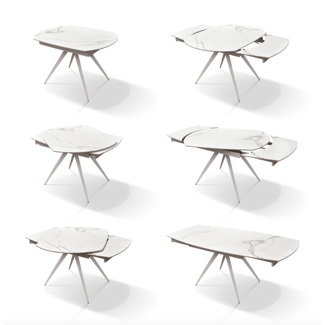 Tavolo allungabile con base in metallo colore bianco, piano lucido arrotondato in ceramica finitura bianco statuario con 2 allunghe da 30 cm
