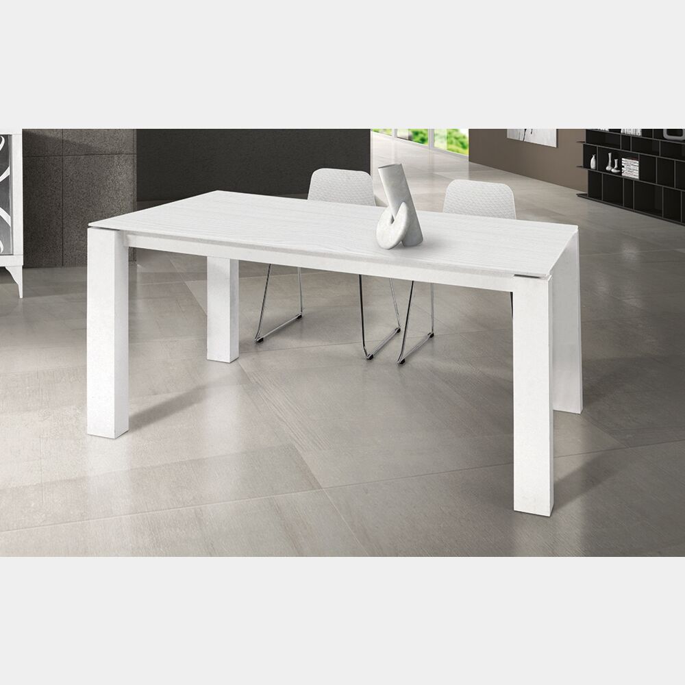 Il tavolo dal design moderno è in finitura bianca. Rispetto ai tavoli di questa collezione, questo è disponibile in una sola misura, ma ha due allunghe da 45 cm.