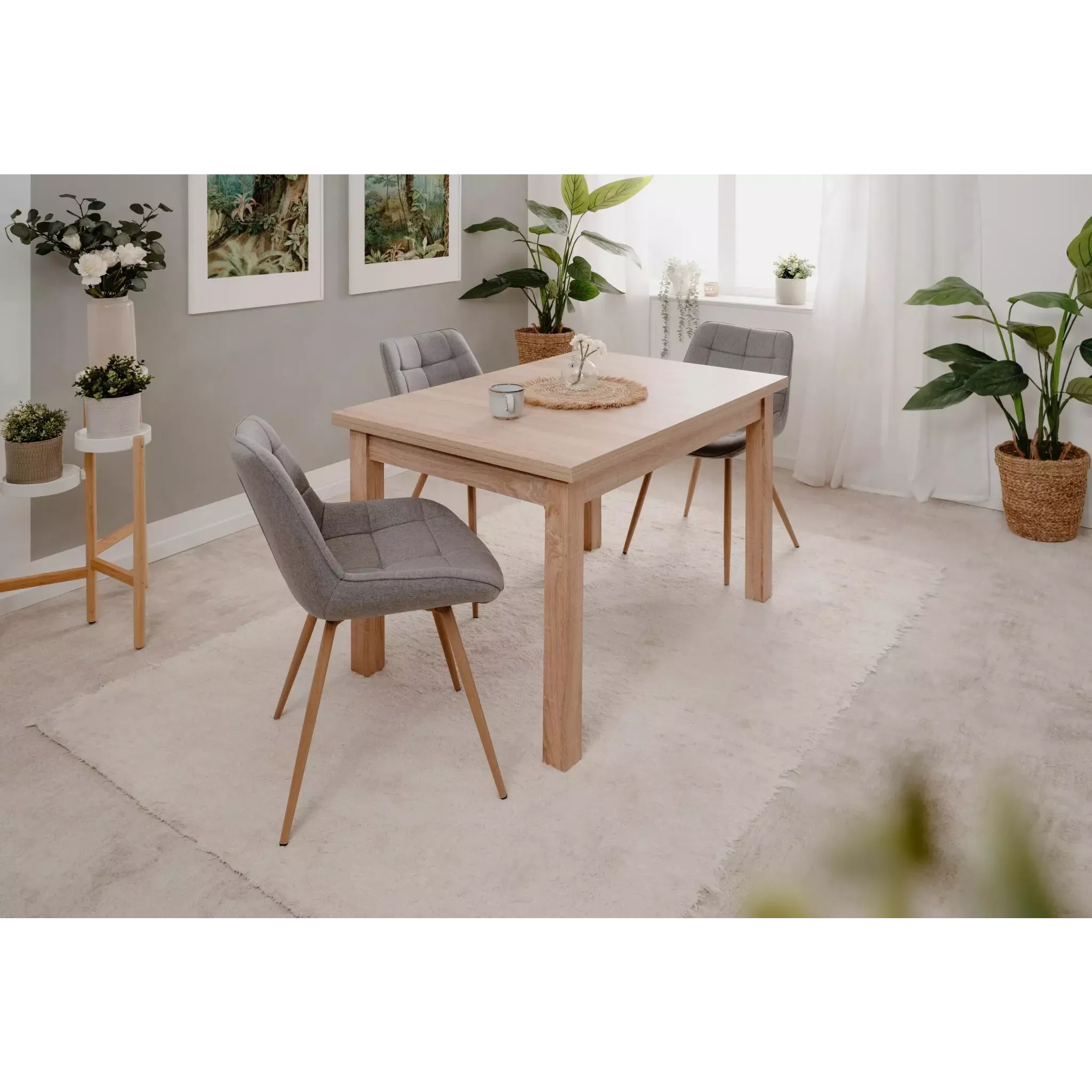Tavolo da pranzo stile nordico, di forma rettangolare, estendibile da 120 a 200 cm di lunghezza.