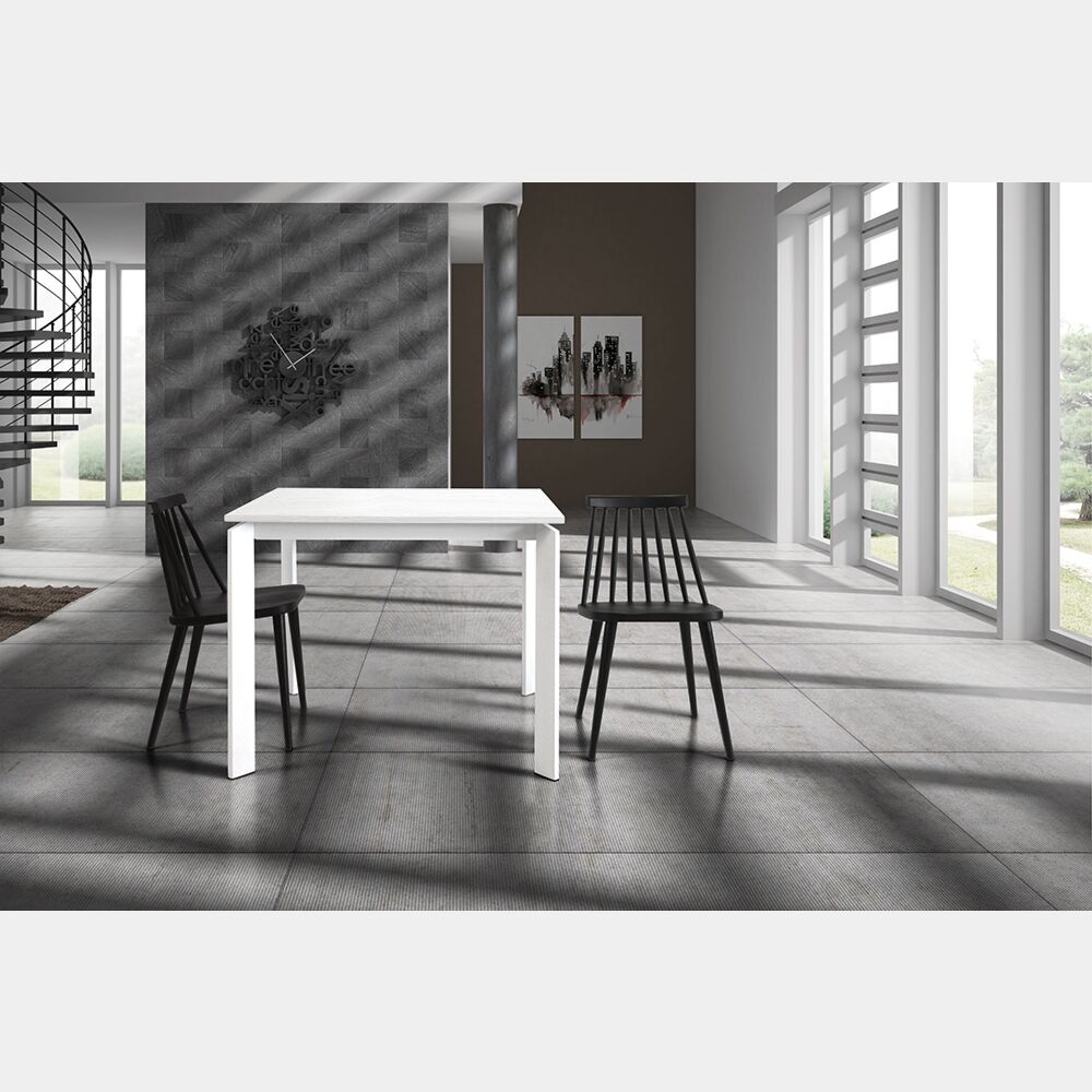 Tavolo daldesign quadrato con 1 allunga. Tavolo moderno 90x90 con 1 all. 60 cm.Tavolo moderno disponibile in una lunghezza. Piano allungabile al centro con gambe biancheTavolo robusto, ideato per sale da pranzo di piccole dimensioni.