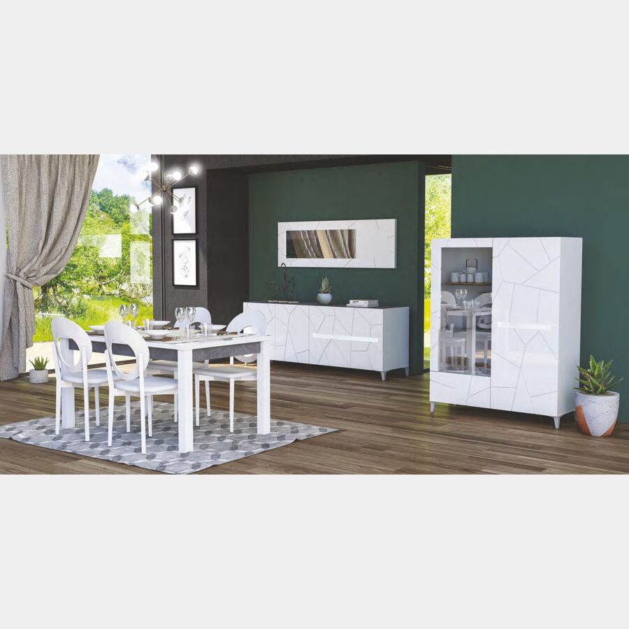 Della stessa collezione fanno parte diversi elementi: porta TV, madia bassa, madia alta, vetrinetta, tavolo da pranzo, specchio, tavolino.
