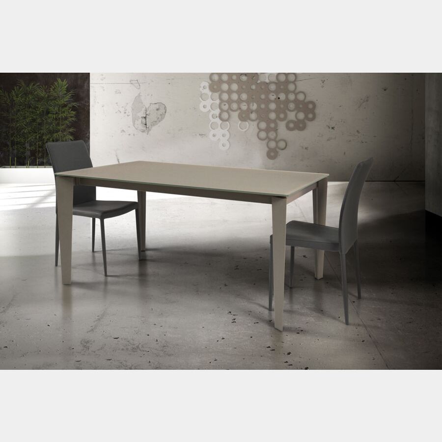Tavolo in vetro allungabile con 2 allunghe da 40 cm. Il tavolo moderno è disponibile con piano in vetro grigio. Completo di 2 allunghe da 40 cm.