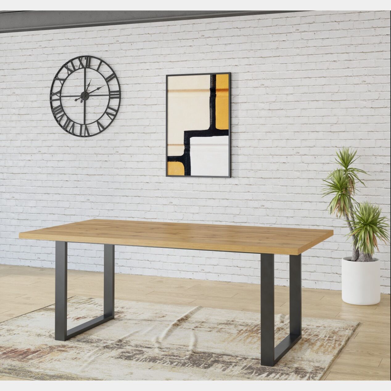 Tavolo moderno fisso L.200, finitura quercia e dettagli metallo nero