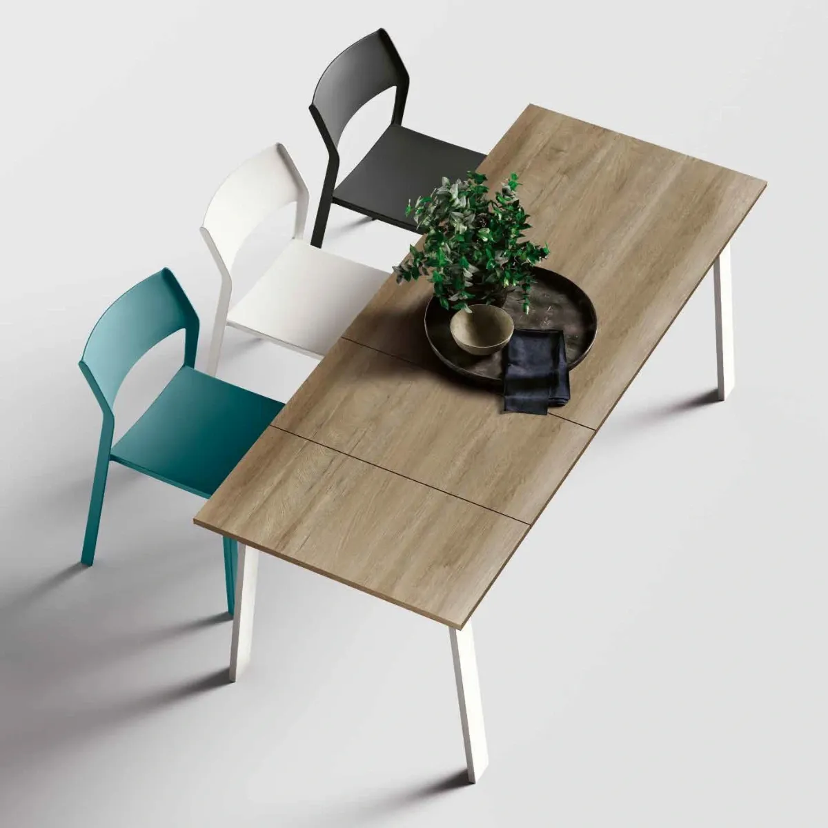 Semplice ma di impatto il tavolo è progettato per cucine o living dalle dimensioni contenute. Se ne quotidiano è utilizzato nella dimensione da 120 in occasioni speciali si allunga fino a 200 cm, ospitando così un maggior numero di persone.