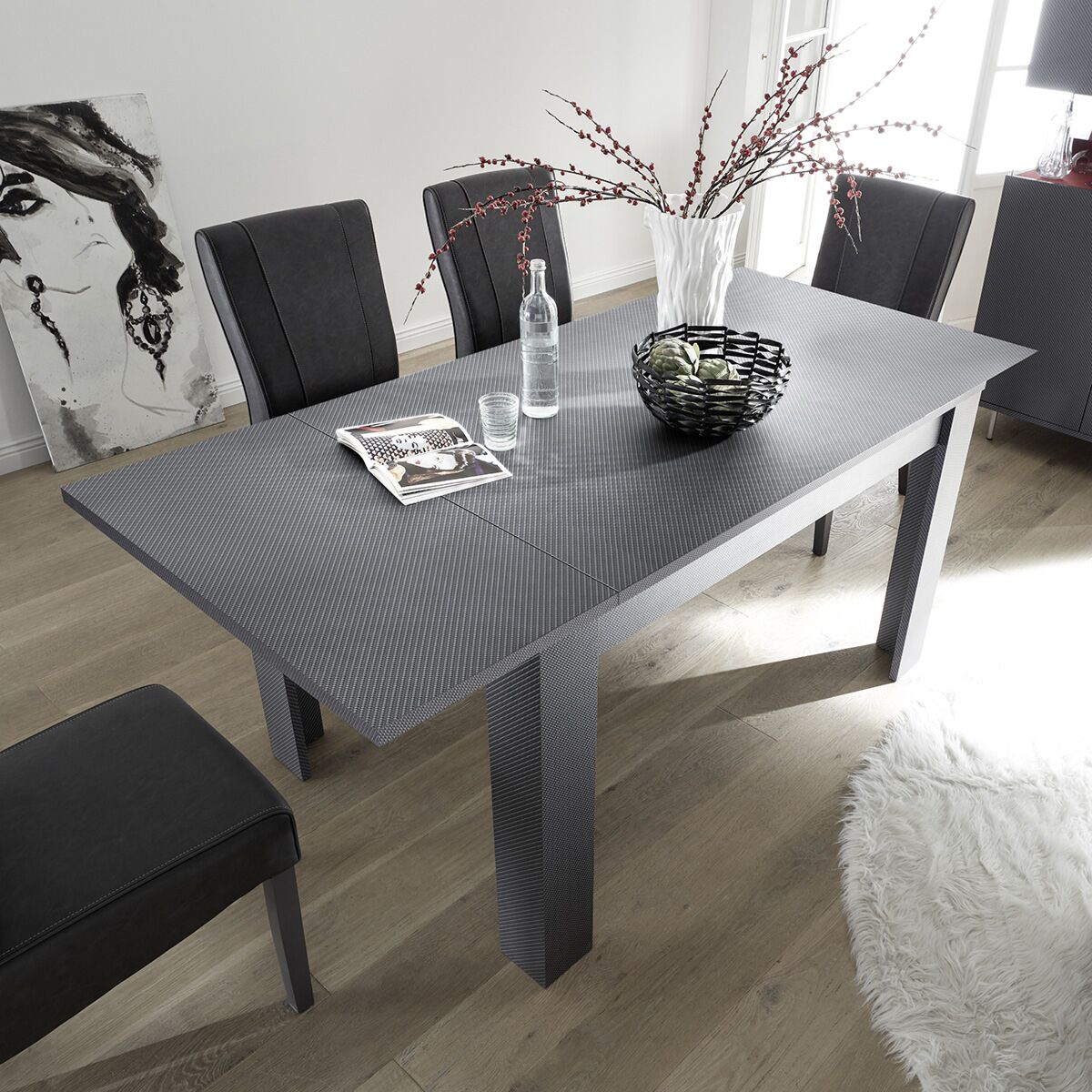 Tavolo moderno e di design, disponibile fisso in due dimensioni, o con allunga, in finitura carbonio, le gambe e il piano sono lavorate con geometriche forme per creare un movimento sinuoso.