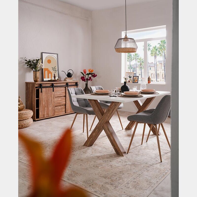 Il tavolo Tromso presenta un design unico e originale. Le finiture in Rovere anticato e Bianco donano un tocco industry e minimal. Il tavolo presente delle particolari gambe ad x, il top è in melaminico.
