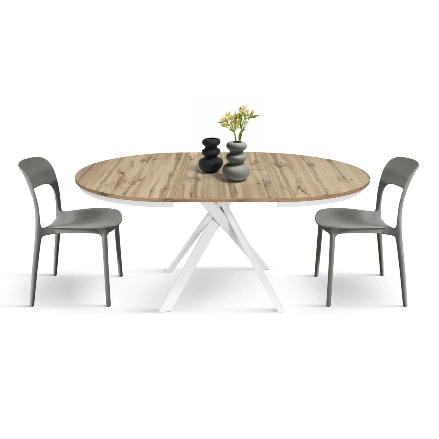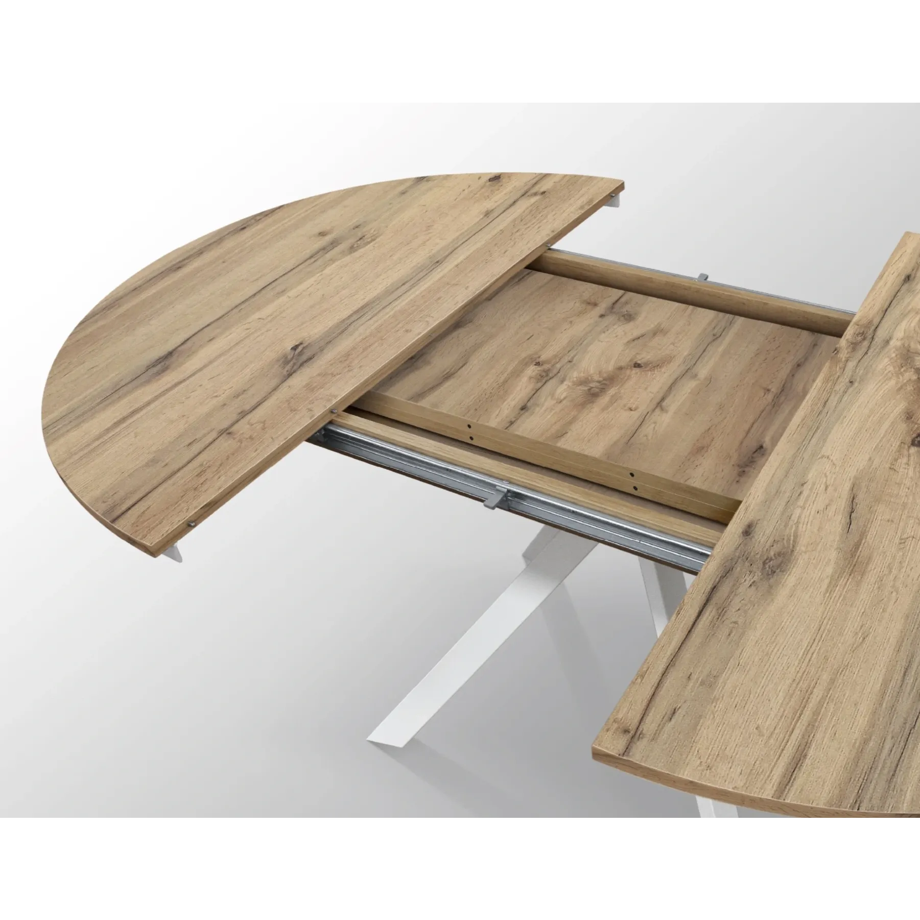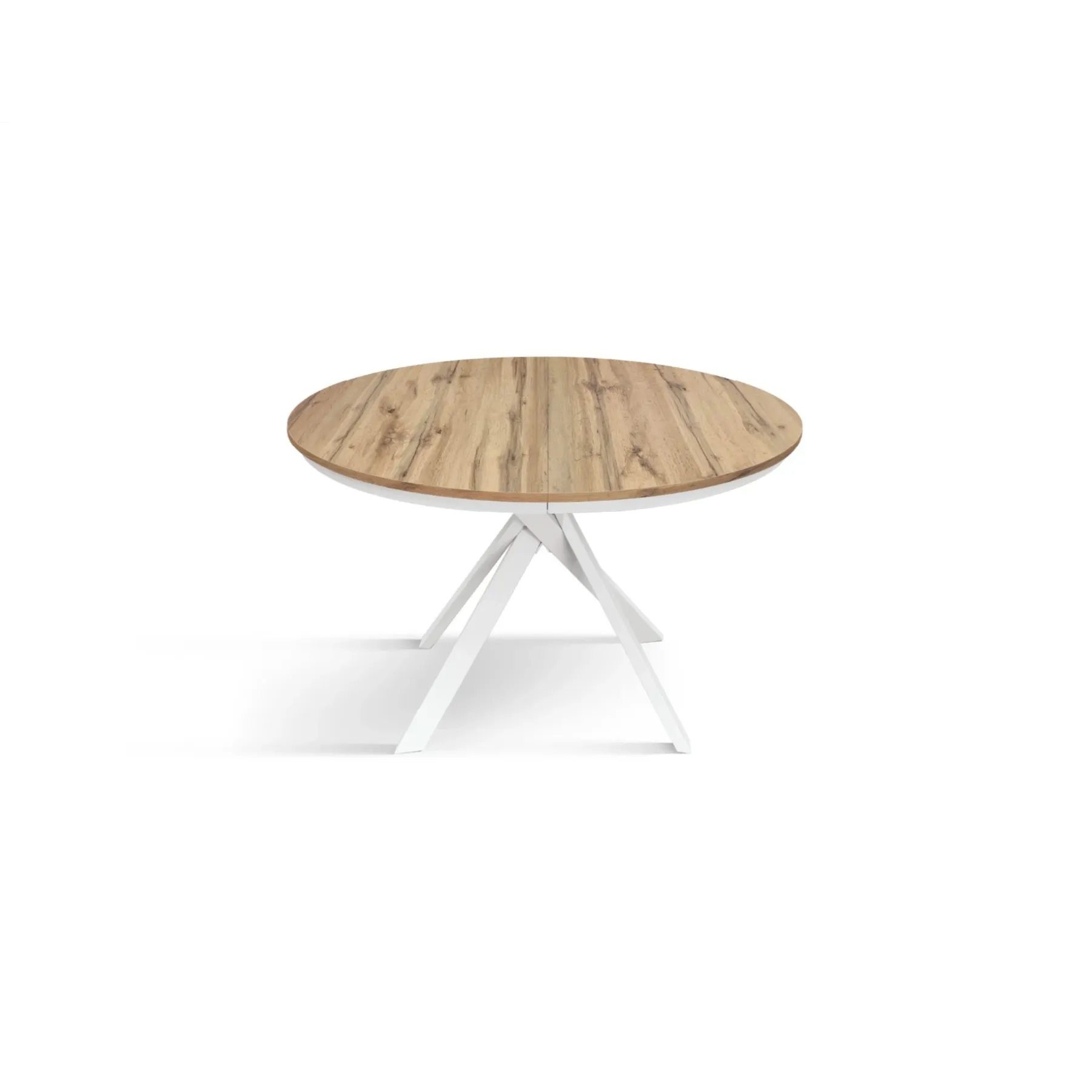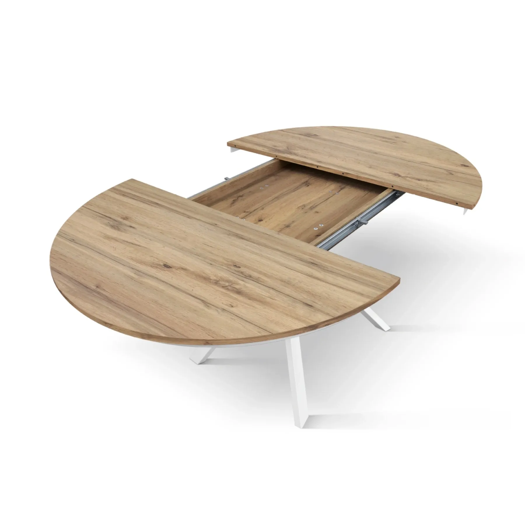 Pratico Tavolo allungabile con base in metallo colore bianco, piano rotondo in nobilitato finitura rovere rustico.