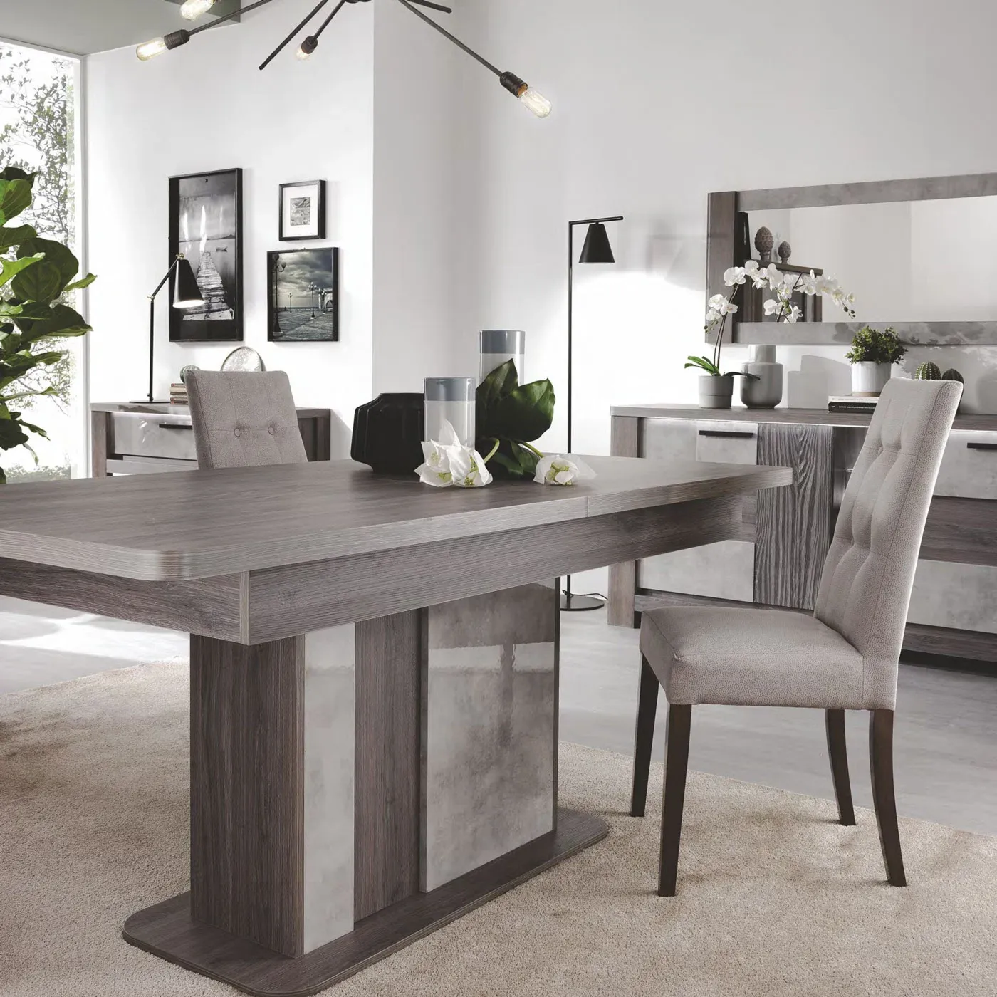 Nuovo tavolo allungabile colore Rovere cenere con particolari in finitura Cemento lucido. Grazie al suo design moderno si può posizionare in un soggiorno, in una cucina o in una sala da pranzo. Offre una soluzione d'arredo unica e originale, con grande personalità.