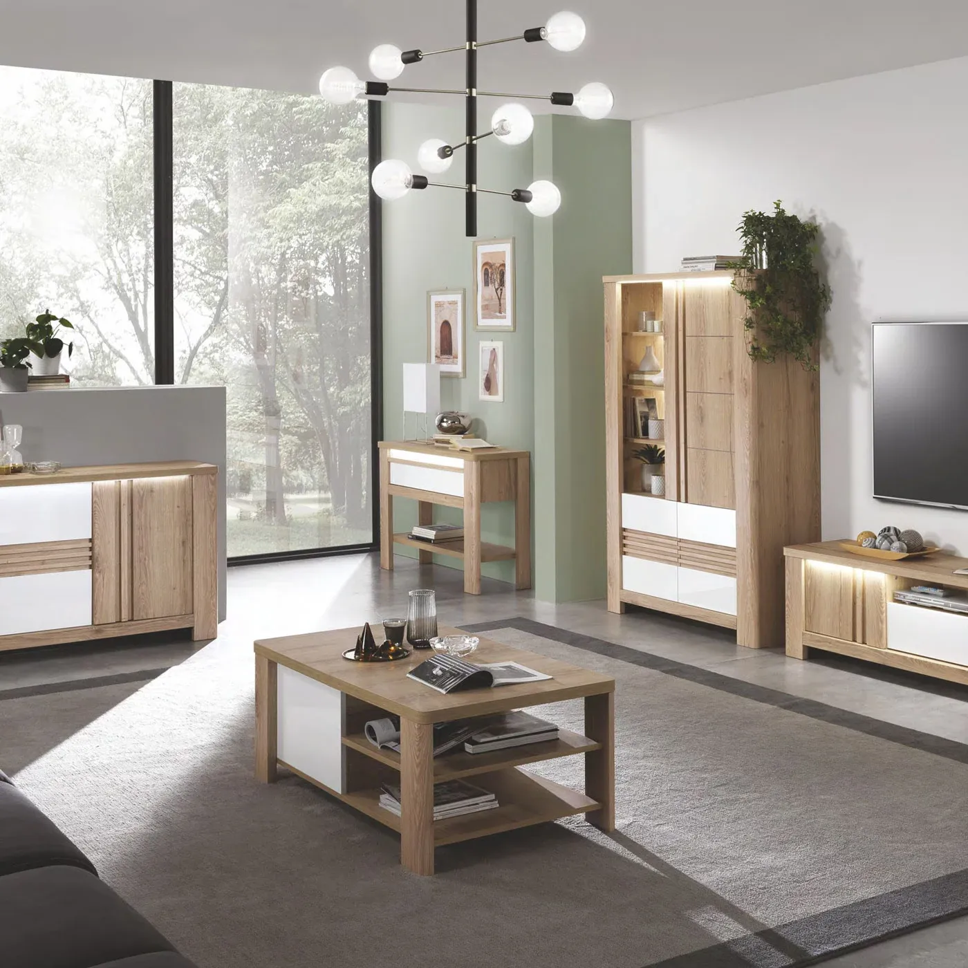 Nuovo tavolo da salotto in finiture Rovere e Bianco laccato. E' costituito da un cassetto, da vano contenitore composto da due ripiani utili per appoggiare il telecomando della Tv, occhiali, libri o riviste. E' ideale per una zona living spaziosa e luminosa. Si rivela sin da subito un'ottima soluzione di arredo se si vuole dare un tocco di originalià, modernità al proprio salotto. Come si nota dall'immagine è sia bello esteticamente da vedere e anche funzionale in quanto spazioso. I particolari sono in finitura Bianco lucido ed è stato prodotto in Italia.