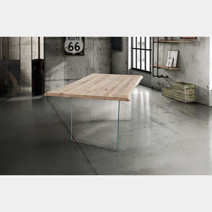 Tavolo Fisso in massello, con nodo aperto. sp. 4cm. Il tavolo moderno scortecciato è disponibile in diverse lunghezze. Piano in massello con nodo aperto e gambe in vetro.