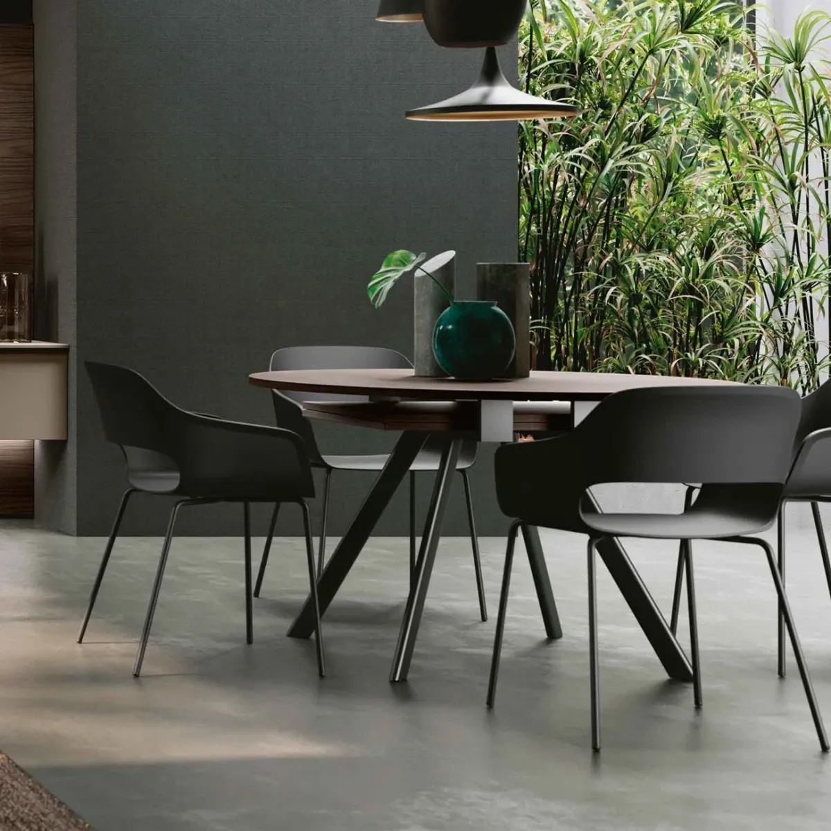 La finitura Noce moro del piano si accosta alle gambe nere, generando armonia e pulizia estetica. L'ampio campionario di tinte disponibili assicura una completa personalizzazione del tavolo per adattarlo al meglio al proprio living.
