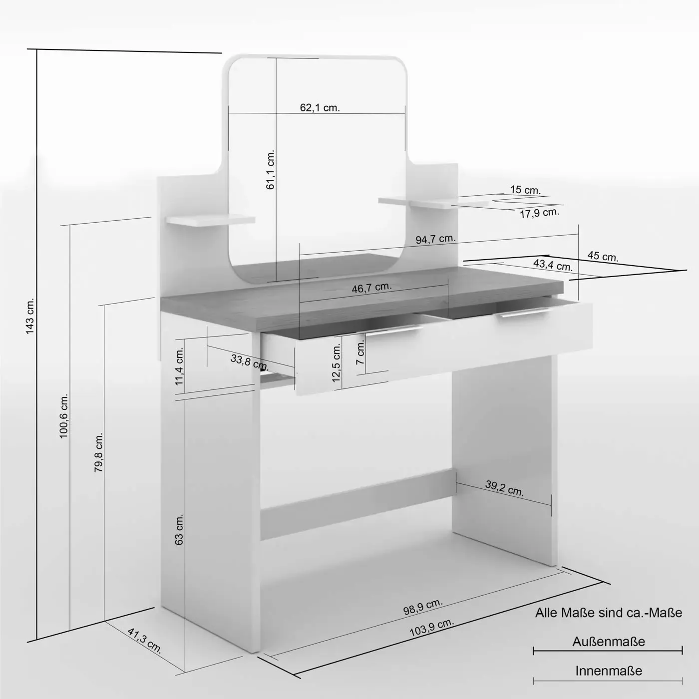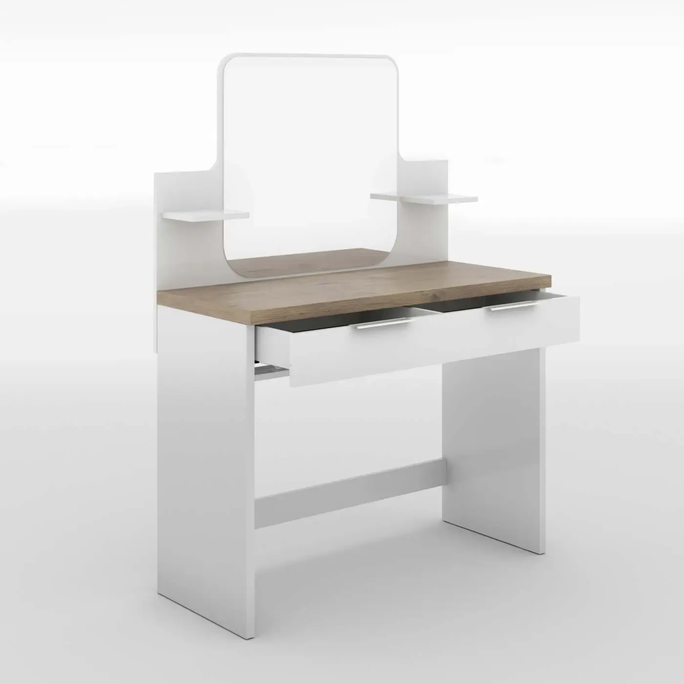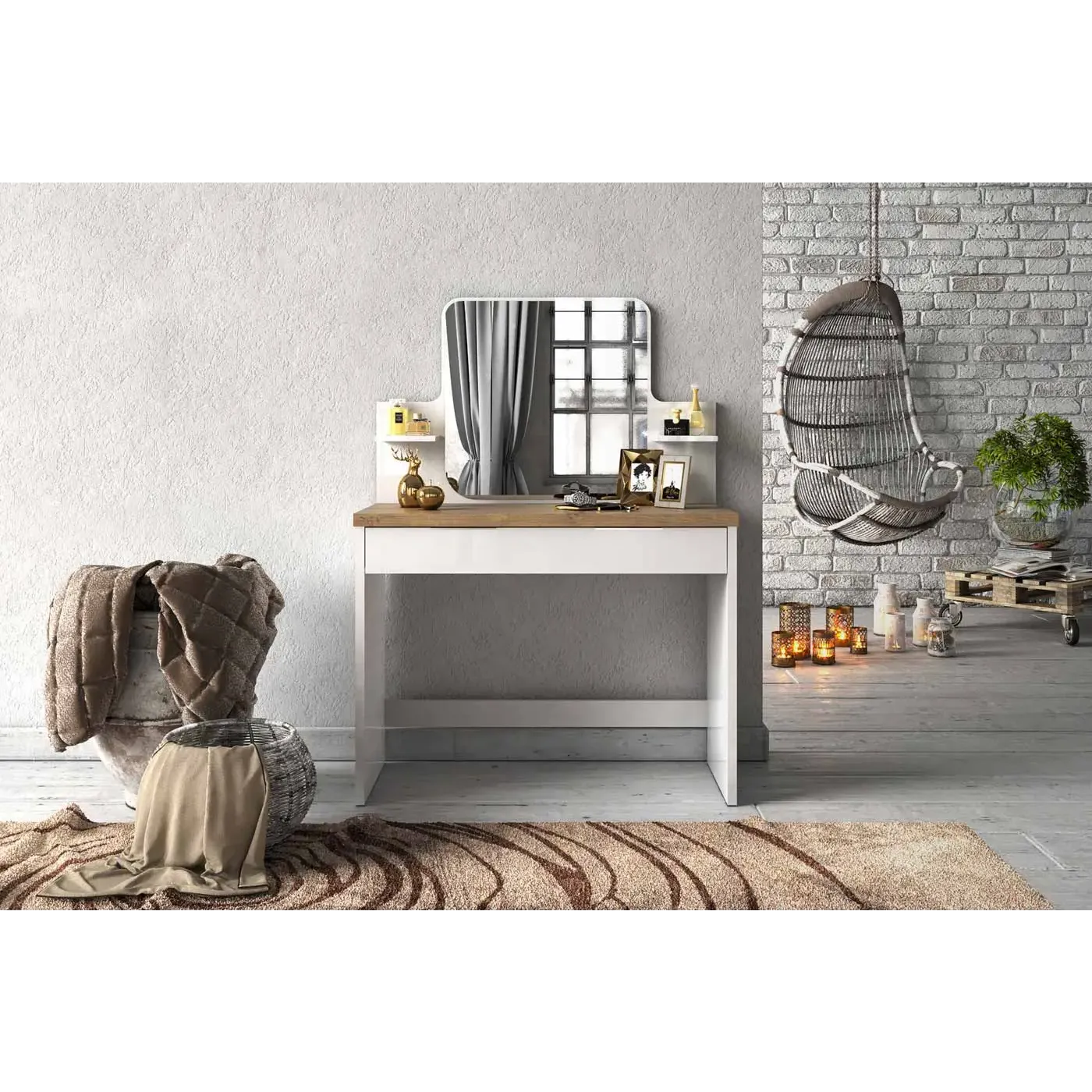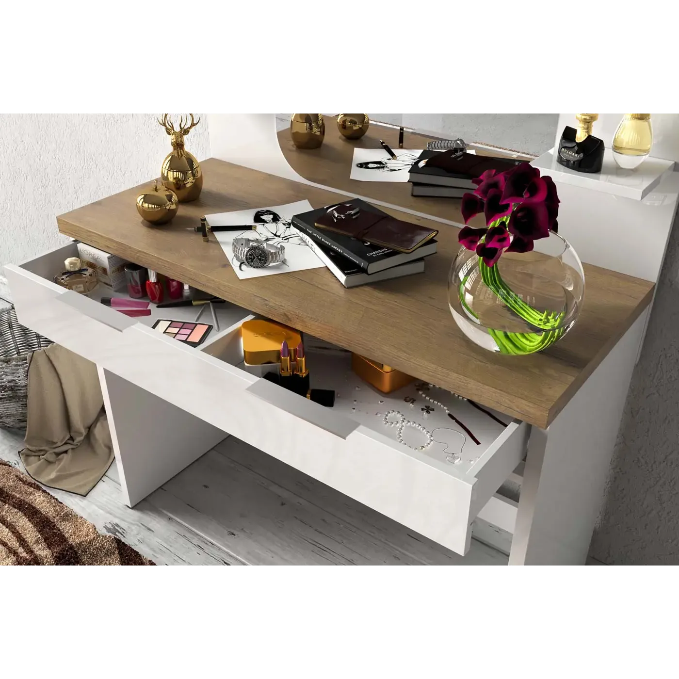 Toletta da trucco con cassetto, colore Bianco lucido e Top Rovere