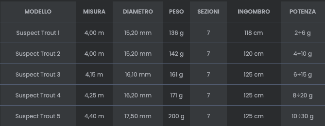 Le Suspect, disponibili in cinque diversi modelli, sono telescopiche per la pesca alla trota in lago.