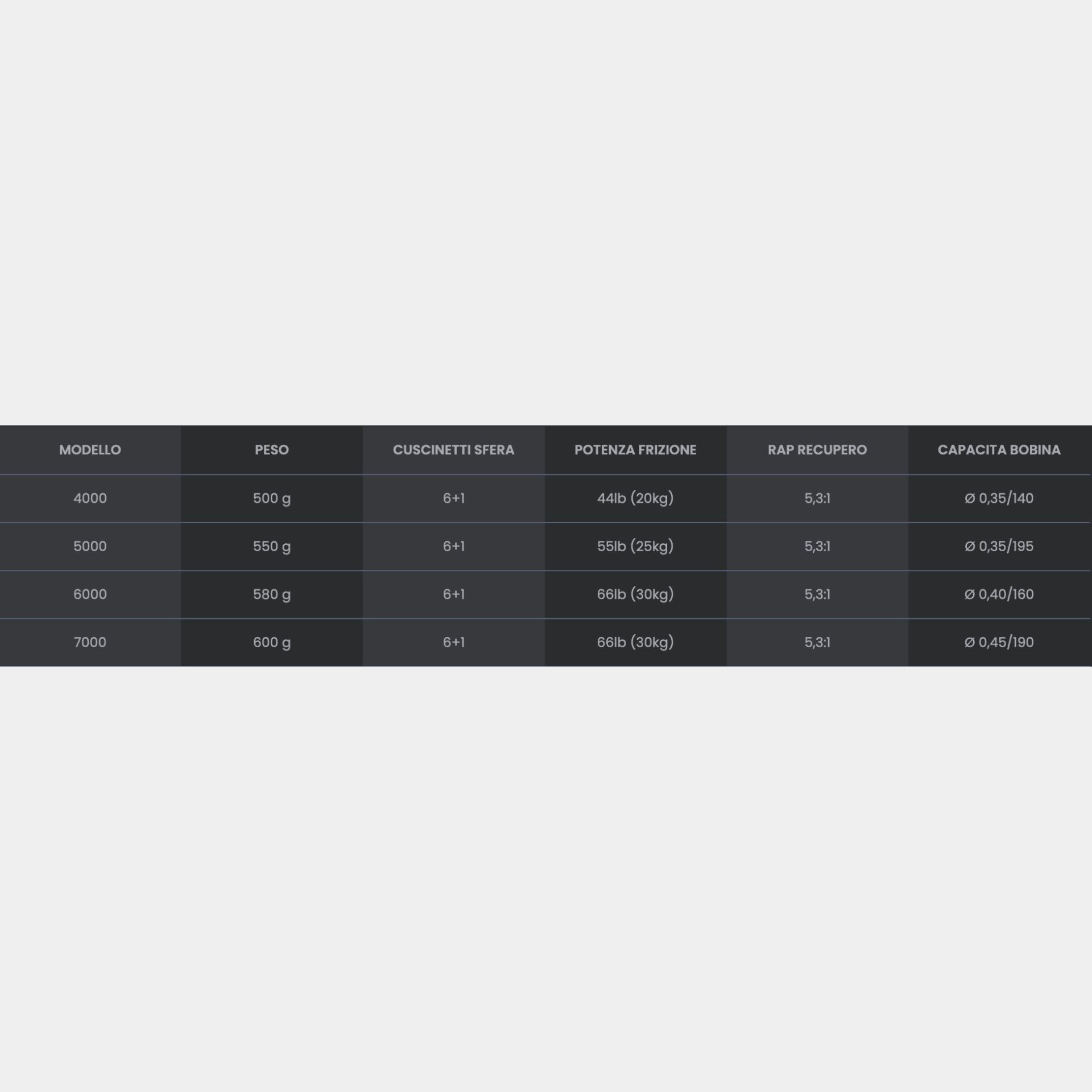 Max Drag 20kg rapporto di recupero 5.3:1- sei cuscinetti schermati più uno a rulli. In questo modello non è previsto l’antiritorno.