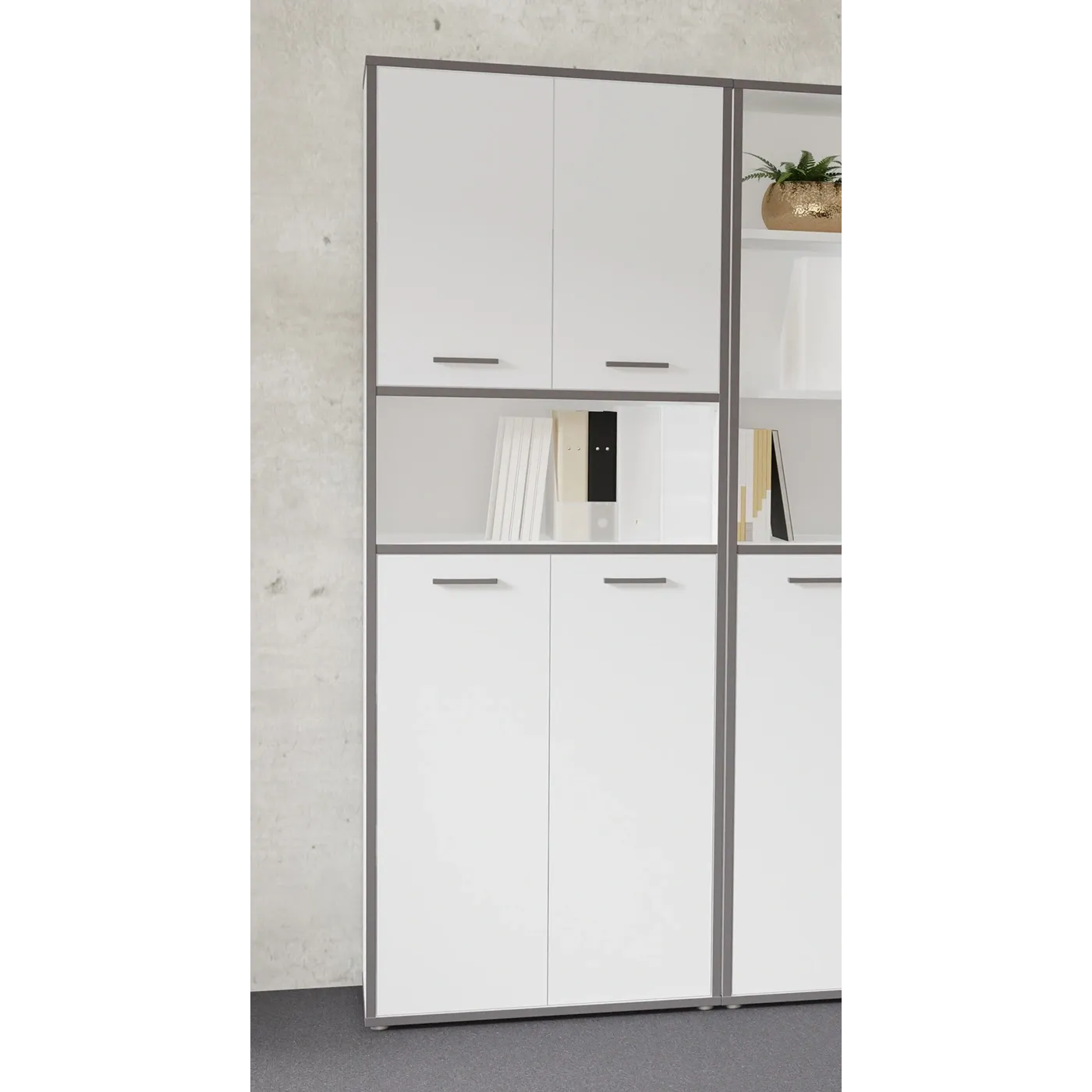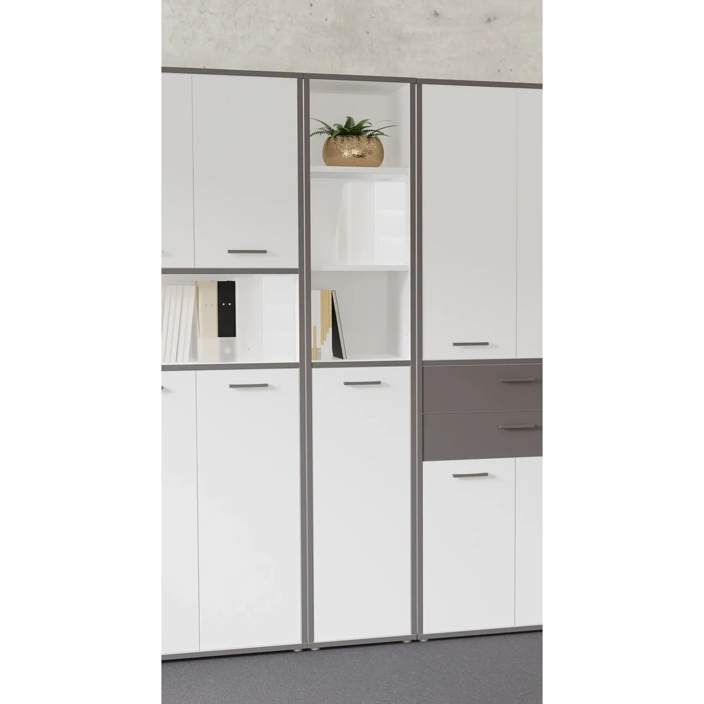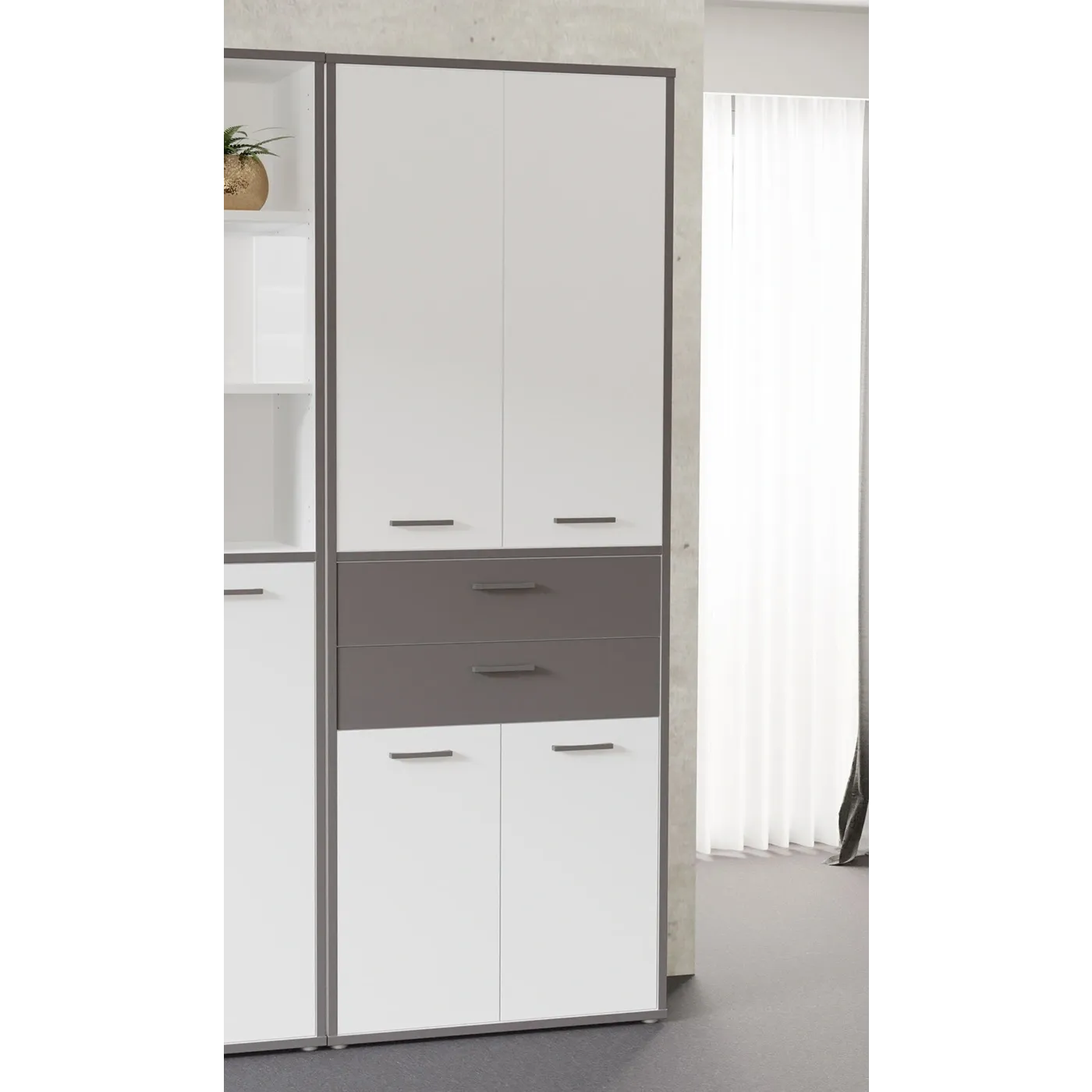 Questo ufficio completo presenta ogni genere di confort e di utilità per il contenimento di faldoni di carte e documenti di ogni sorta e degli oggetti più disparati. Dal lato della bellezza non si fa trovare impreparato, potendo infatti esibire una combinazione di colori unica nel suo genere come quella del Bianco con il Grigio scuro.