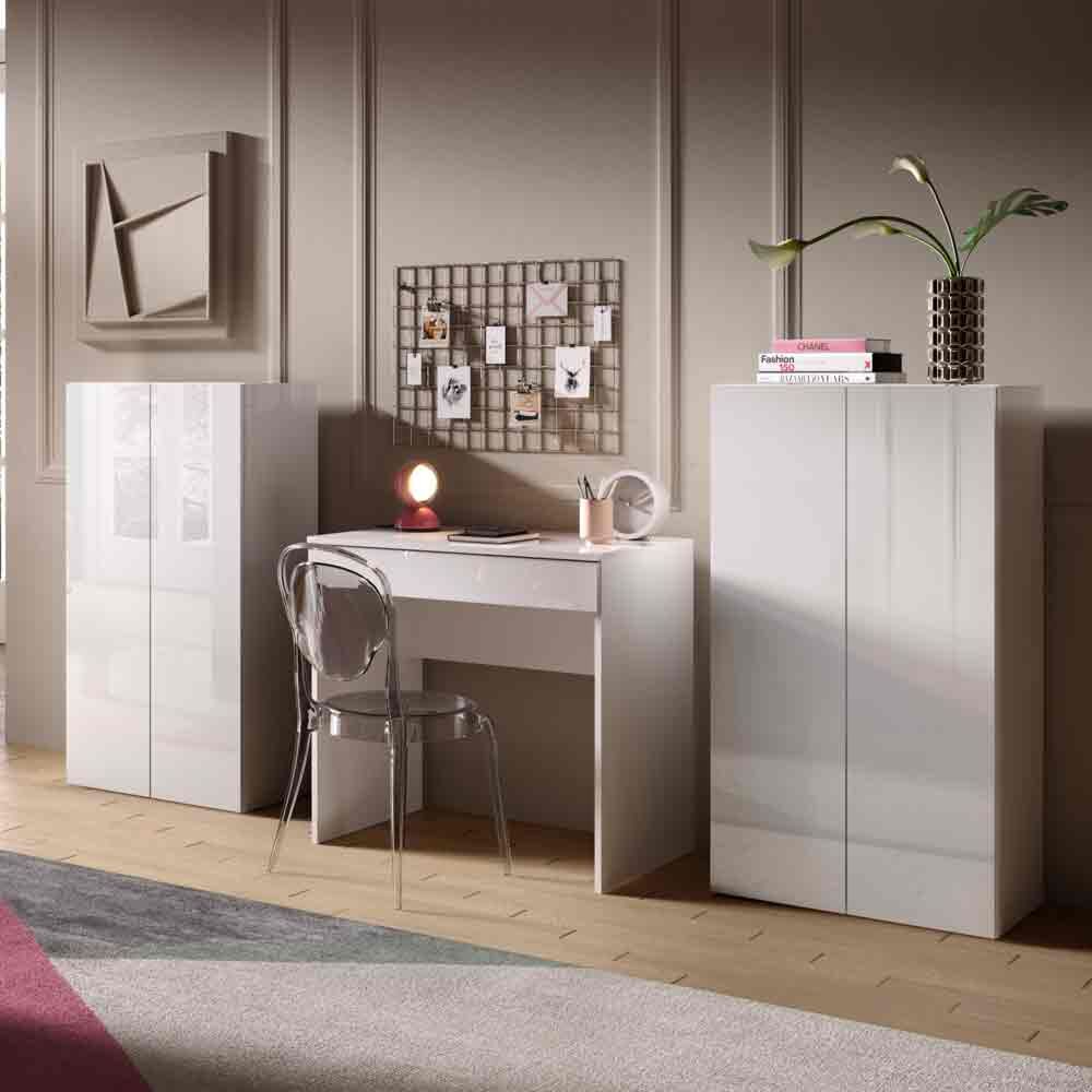 Ufficio moderno composto da 2 madie e una scrivania, finitura Bianco Lucido