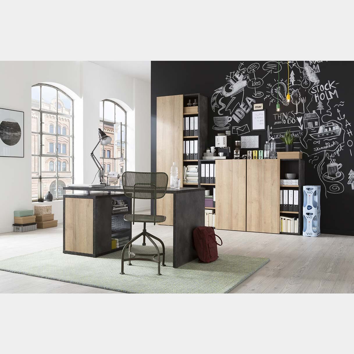 L'ufficio Industry è molto capiente, infatti grazie alla presenza dei numerosi ripiani non avrai più problemi di spazio! La struttura è in finitura ossido mentre i ripaini e le ante sono in rovere, l'effetto che risulta è unico.