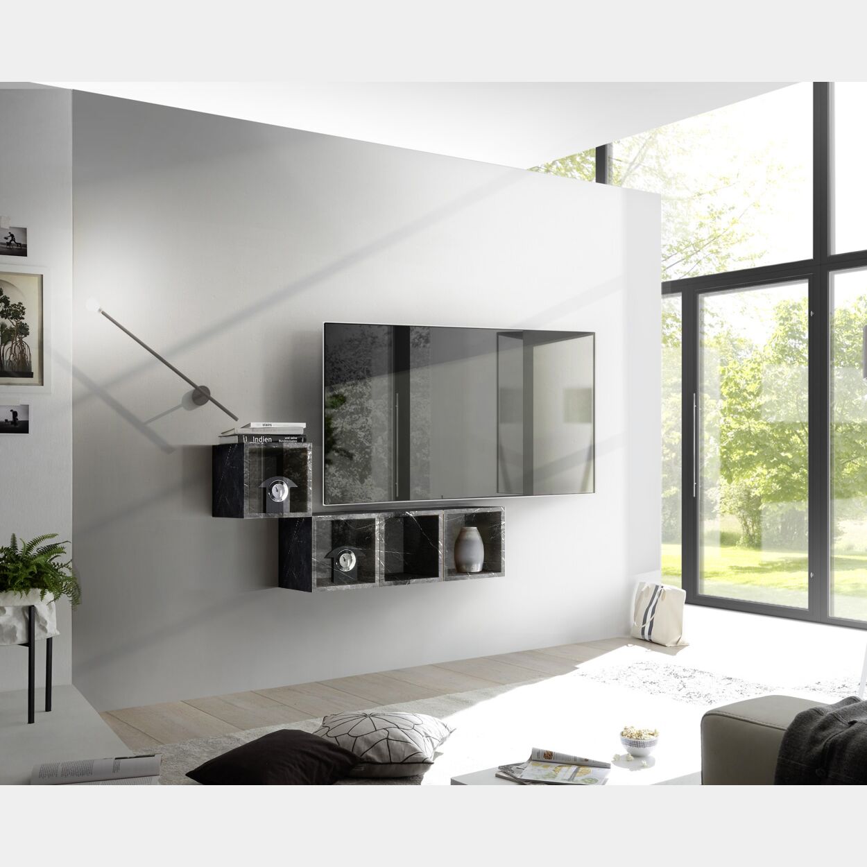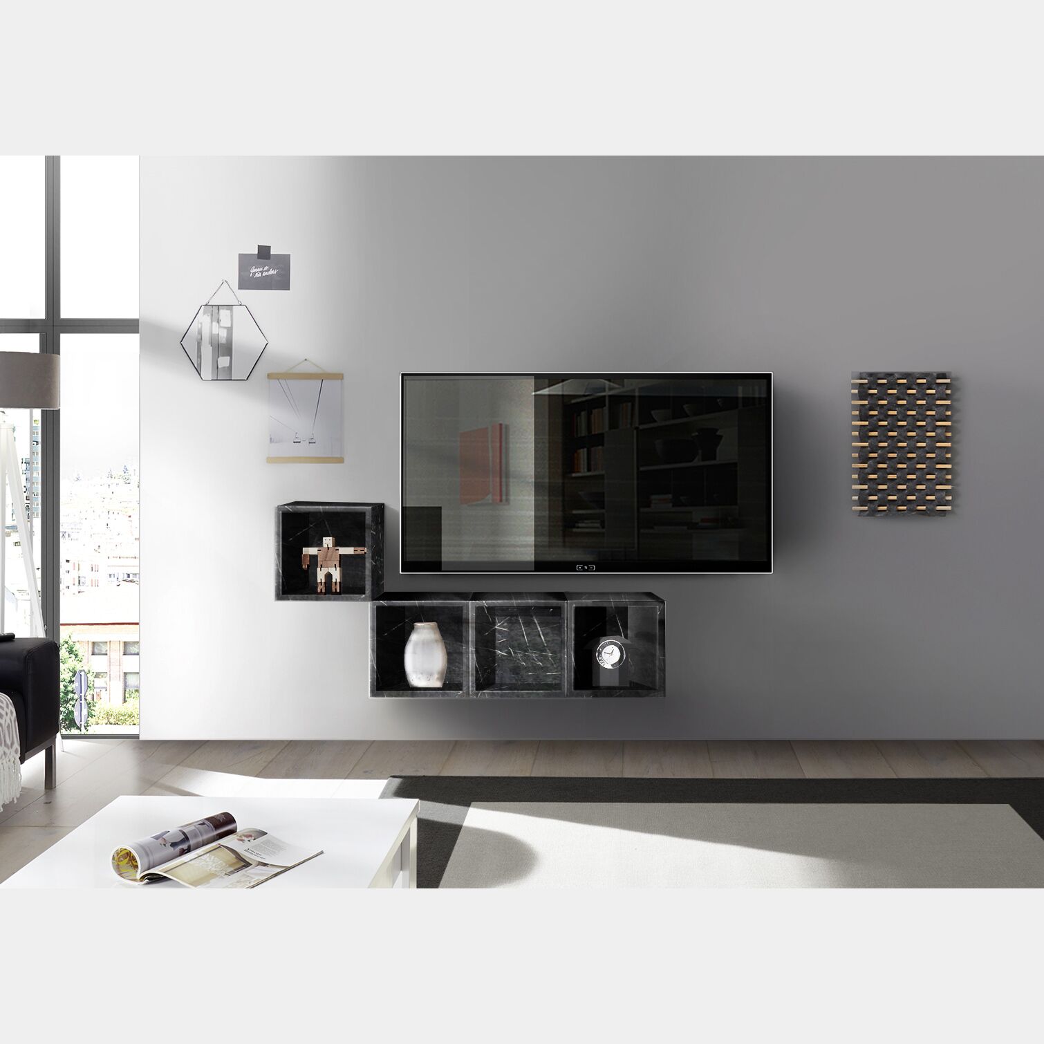Arredare la tua zona giorno con i vani porta TV sospesi non è mai stato cosi facile. La composizione Porta TV formata dai 4 vani a giorno in finitura Marmo Lucido Nero, saprà dare vigore al vostro soggiorno. Il prodotto di alta qualità esclusivamente MADE IN ITALY è proposta da primaria azienda leader nel settore arredamento moderno.