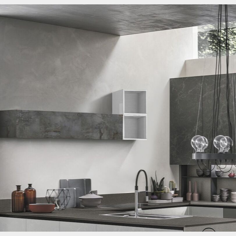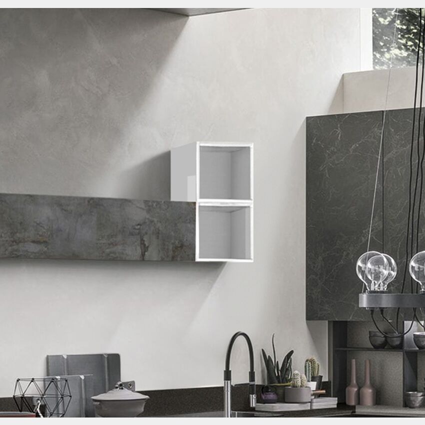 Il vano a giorno da cucina è proposto in finitura Bianco lucido. Il vano sospeso da cucina è disponibile anche in altre finiture come: noce stelvio, noce dark, ossido, grigio artico, beton, ossido, grigio lucido, giallo, rosso, blu e marmo lucido nero.