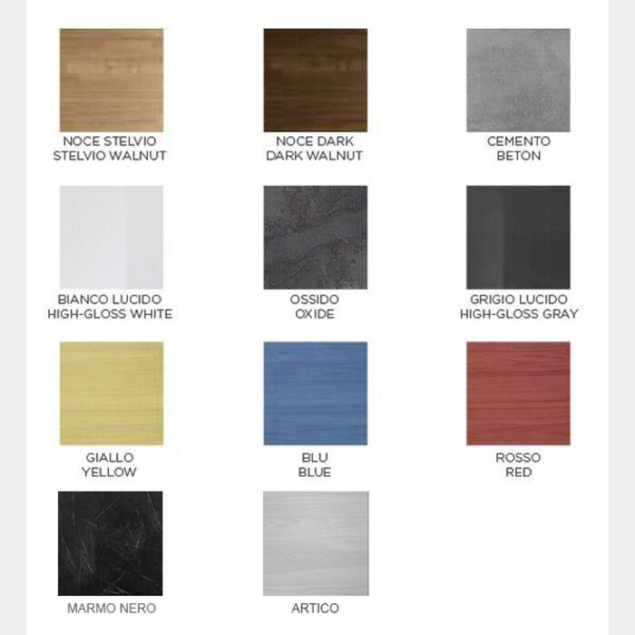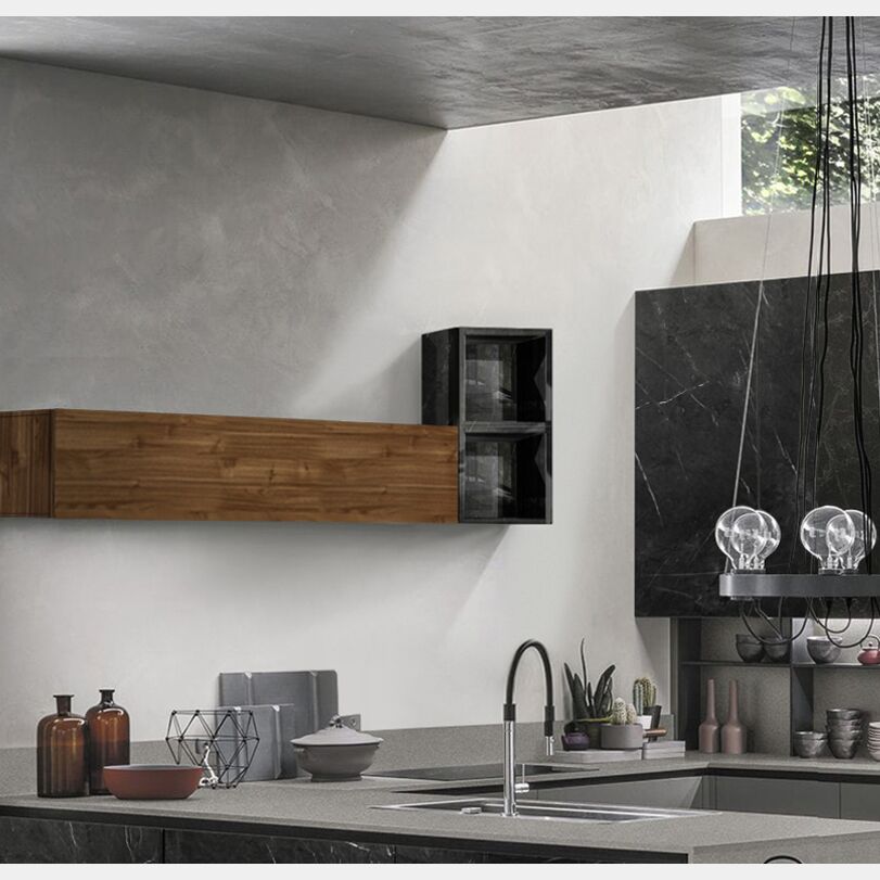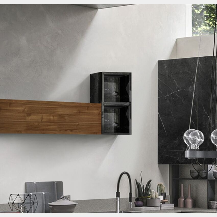Il vano a giorno può essere abbinato a pensili, ribalte, cubi e vasistas nella stessa finitura oppure in tinte differenti per creare un piacevole contrasto. Il vano a giorno da cucina è proposto in effetto Marmo nero lucido. Il vano sospeso da cucina è disponibile anche in altre finiture come: noce stelvio, bianco lucido, noce dark, grigio artico, beton, ossido, grigio lucido, giallo, rosso, ossido e marmo blu.