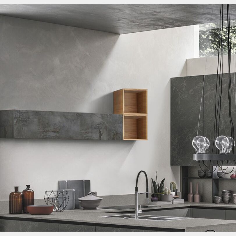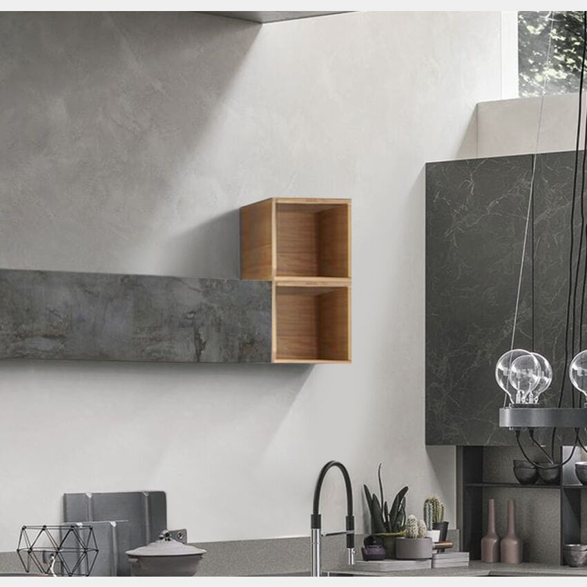 Il vano a giorno può essere abbinato a pensili, ribalte, cubi e vasistas nella stessa finitura oppure in tinte differenti per creare un piacevole contrasto. Il vano a giorno da cucina è proposto in finitura Noce stelvio. Il vano sospeso da cucina è disponibile anche in altre finiture come: noce stelvio, bianco lucido, ossido, grigio artico, beton, ossido, grigio lucido, giallo, rosso, blu e marmo lucido nero.