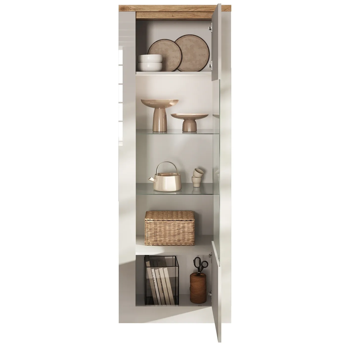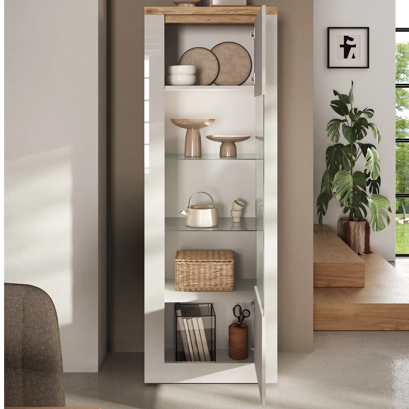Vetrina ad un anta con pannello di vetro al centro e di legno alle estremità. Si caratterizza per i suoi 2 ripiani in legno e 2 in vetro e la per la colorazione in Bianco lucido e Cadiz.