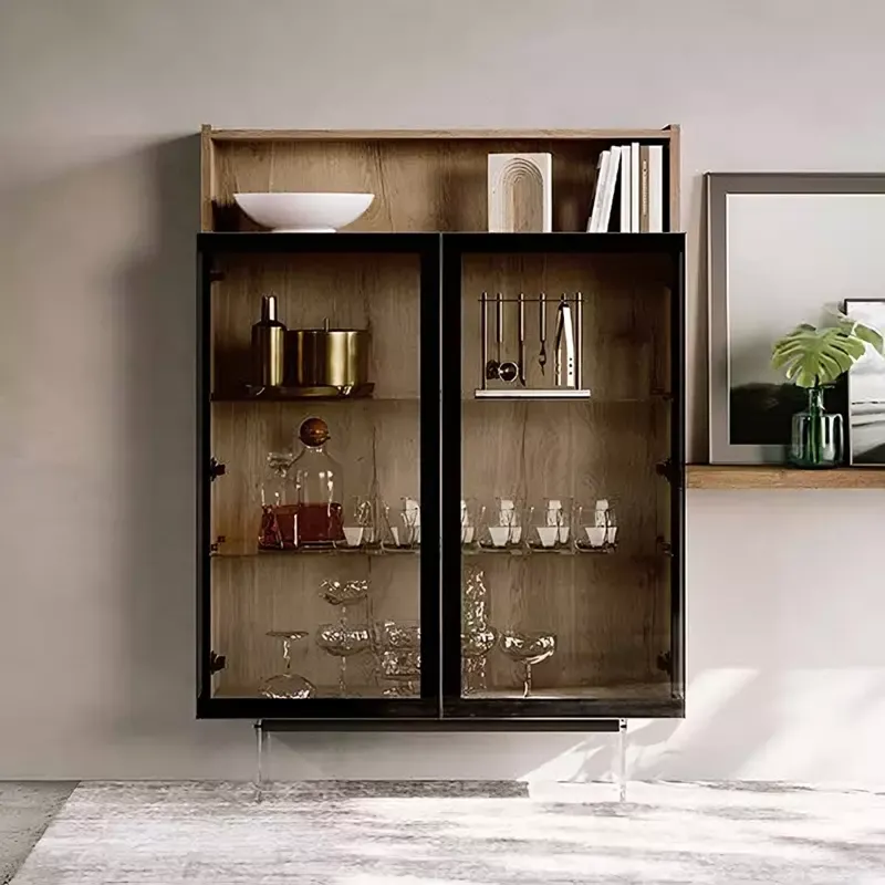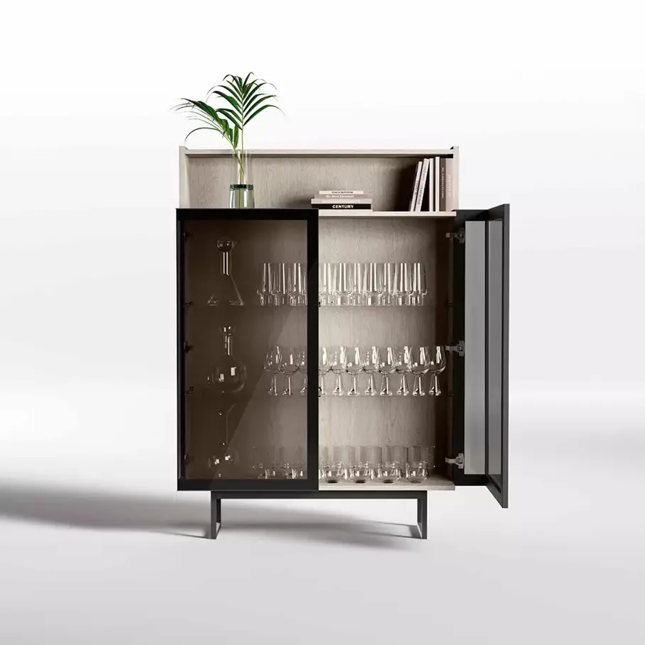 La vetrina presenta due ripiani interni che offrono un'ampia capienza per bicchieri, calici, tazzine e molto altro. Le due ante in vetro fumè richiamano la tonalità scura del telaio e dei piedini P.18.
