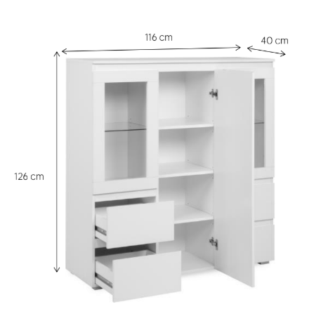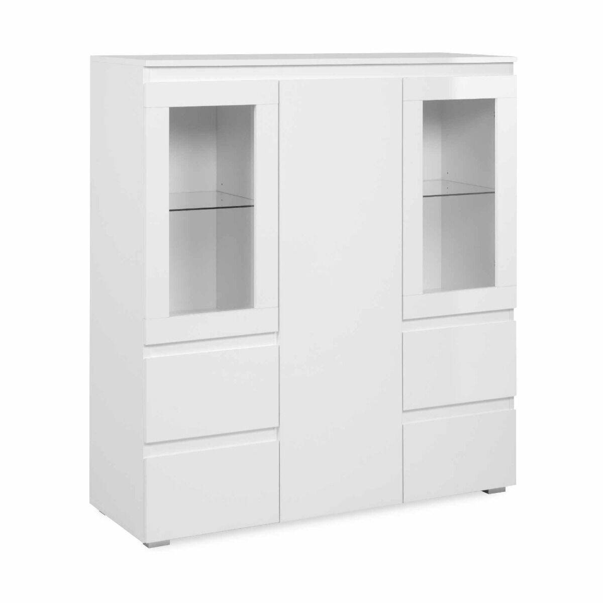 Vetrina bassa 3 ante e 4 cassetti, colore Bianco lucido