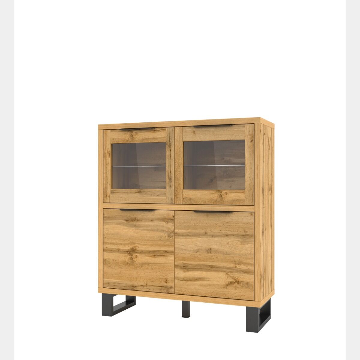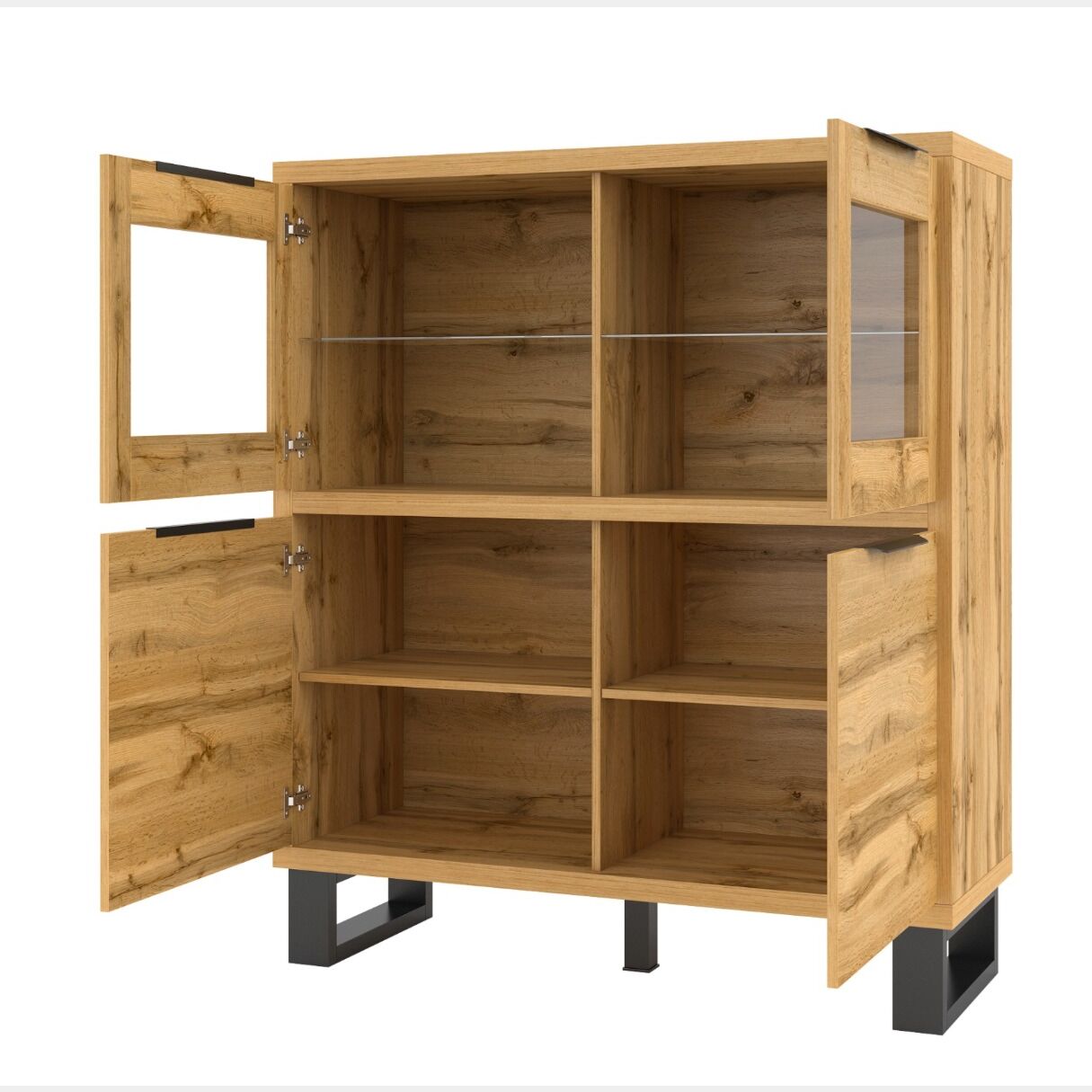 Vetrina bassa 4 ante e 6 ripiani, finitura quercia e metallo nero