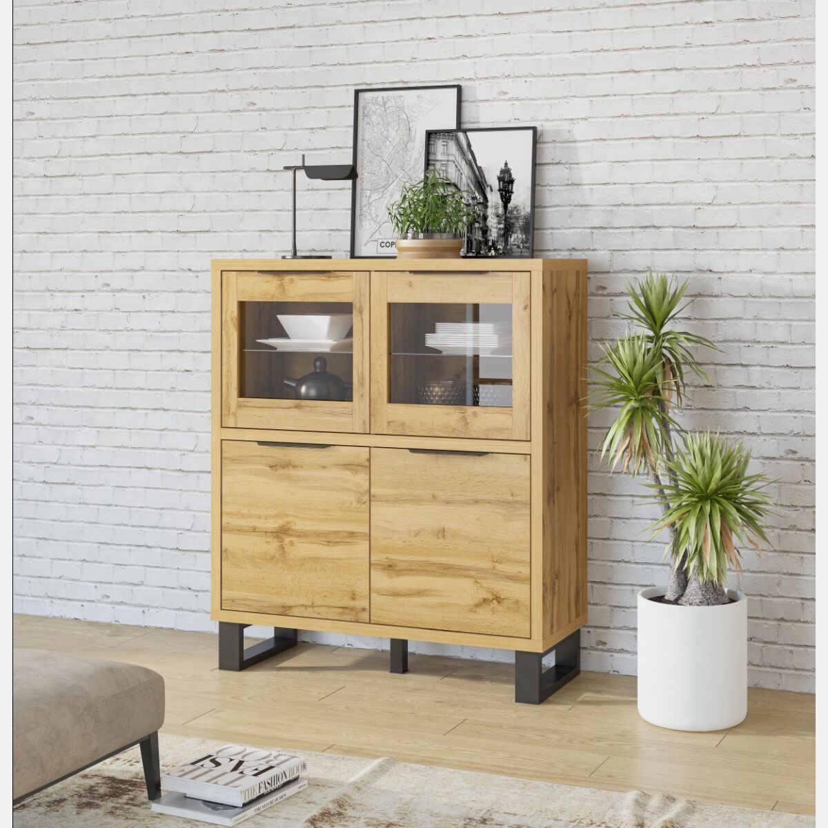 Caratterizzata dall'unione di colori contemporanei e naturali, è perfetta per valorizzare e rendere unici gli ambienti. Riordina tutti i bicchieri, calici, posate e piatti nelle ante chiuse e posiziona gli elementi più eleganti in bella mostra nella parte vetrata.