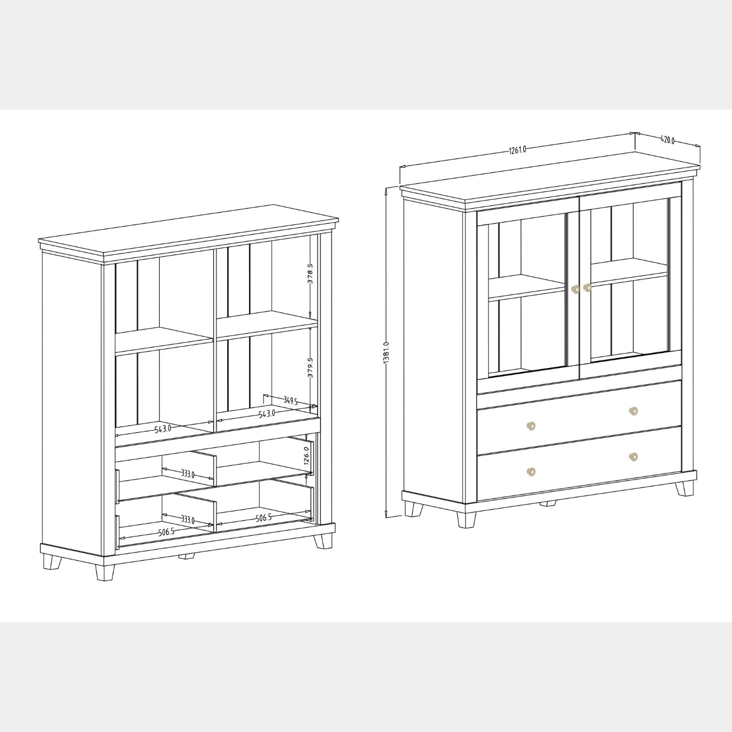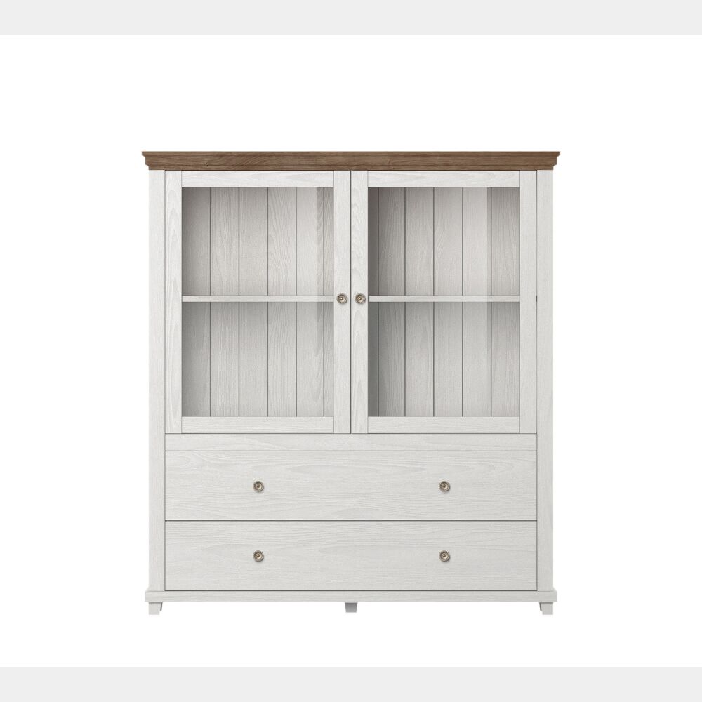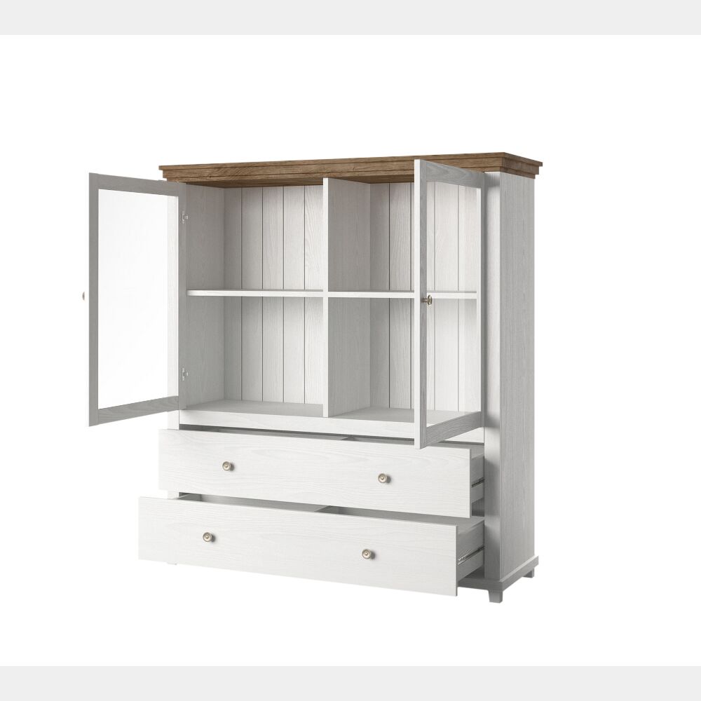 Vetrina bassa 2 ante con vetro e 2 cassetti finitura bianco frassinato e rovere.