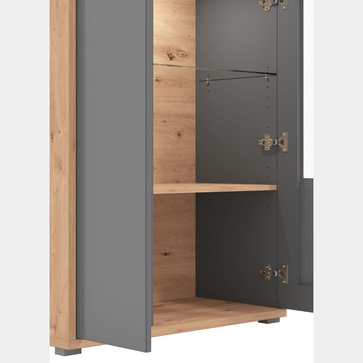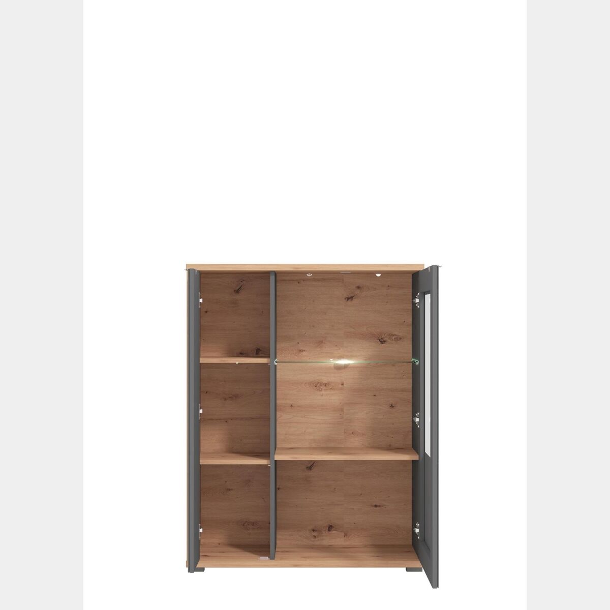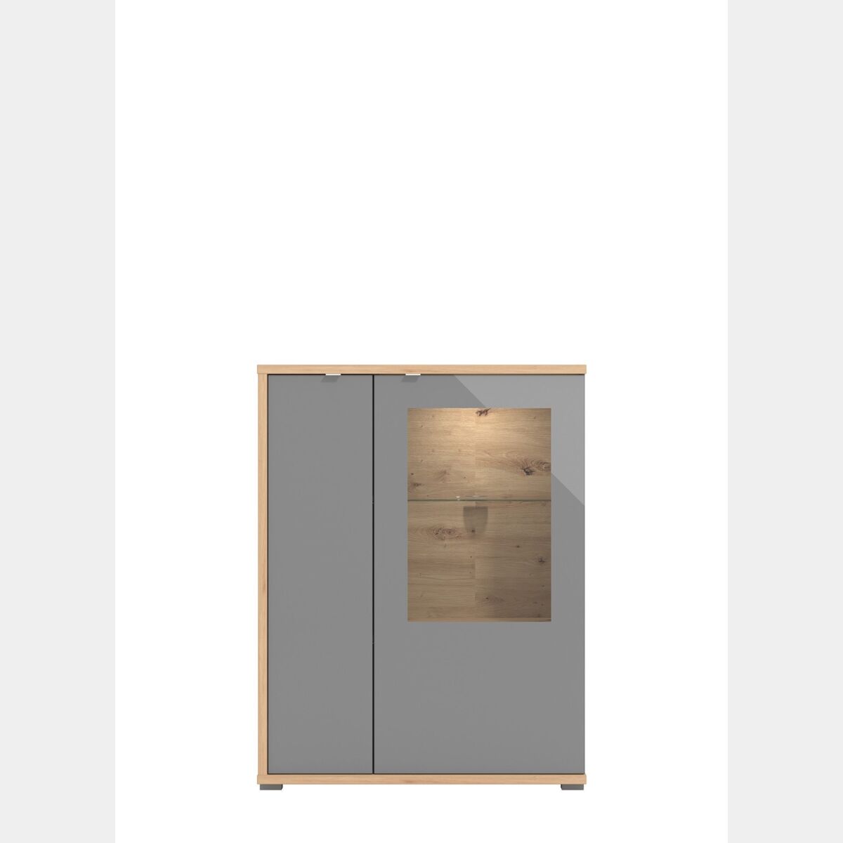 Vetrina bassa con ante vetro grigio, finitura Grafite e Rovere