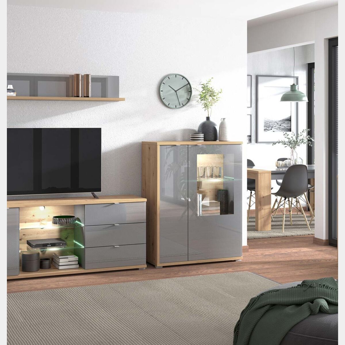 La vetrina è caraterizzata da un design moderno dalle linee geometriche chiare. La combinazione del legno in Rovere, che evoca il calore dell'ambiente, al vetro Grigio grafite rendono la vetrina una scelta ideale per arredare il soggiorno o la sala da pranzo.