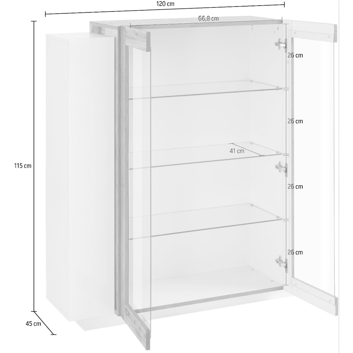 La vetrina è composta da 2 ante vetro contornate da un bordo in finitura Pero. All'interno sono presenti 3 ripiani in vetro, ciò consente alla vetrina di risultare molto capiente e spaziosa.