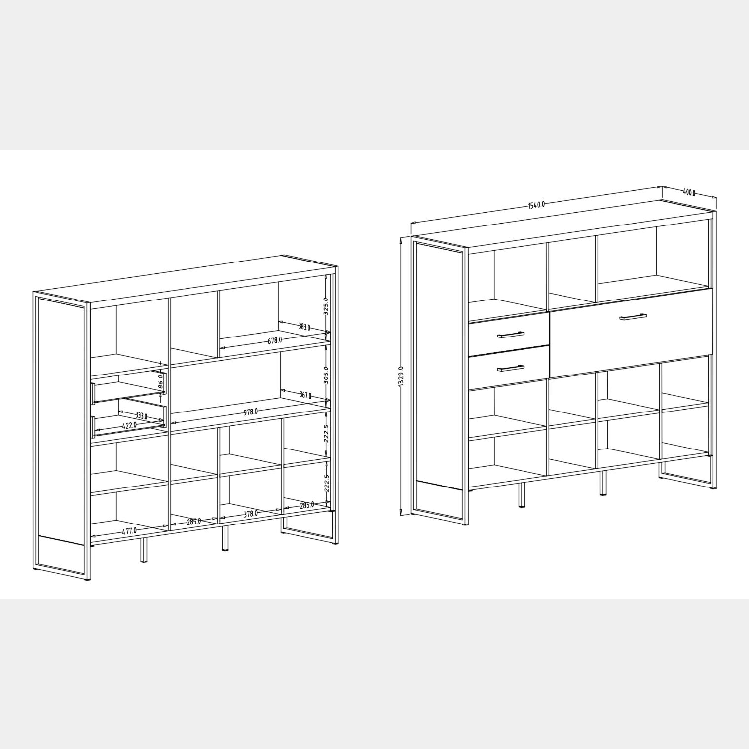 E' formata da undici vani a giorno, ideali contenere DVD, libri, souvenir, piante, candele, soprammobili ed altri oggetti quotidiani, con due cassetti ed una ribalta che permettono di raccogliere tutto ciò che non vorrai mostrare agli ospiti.