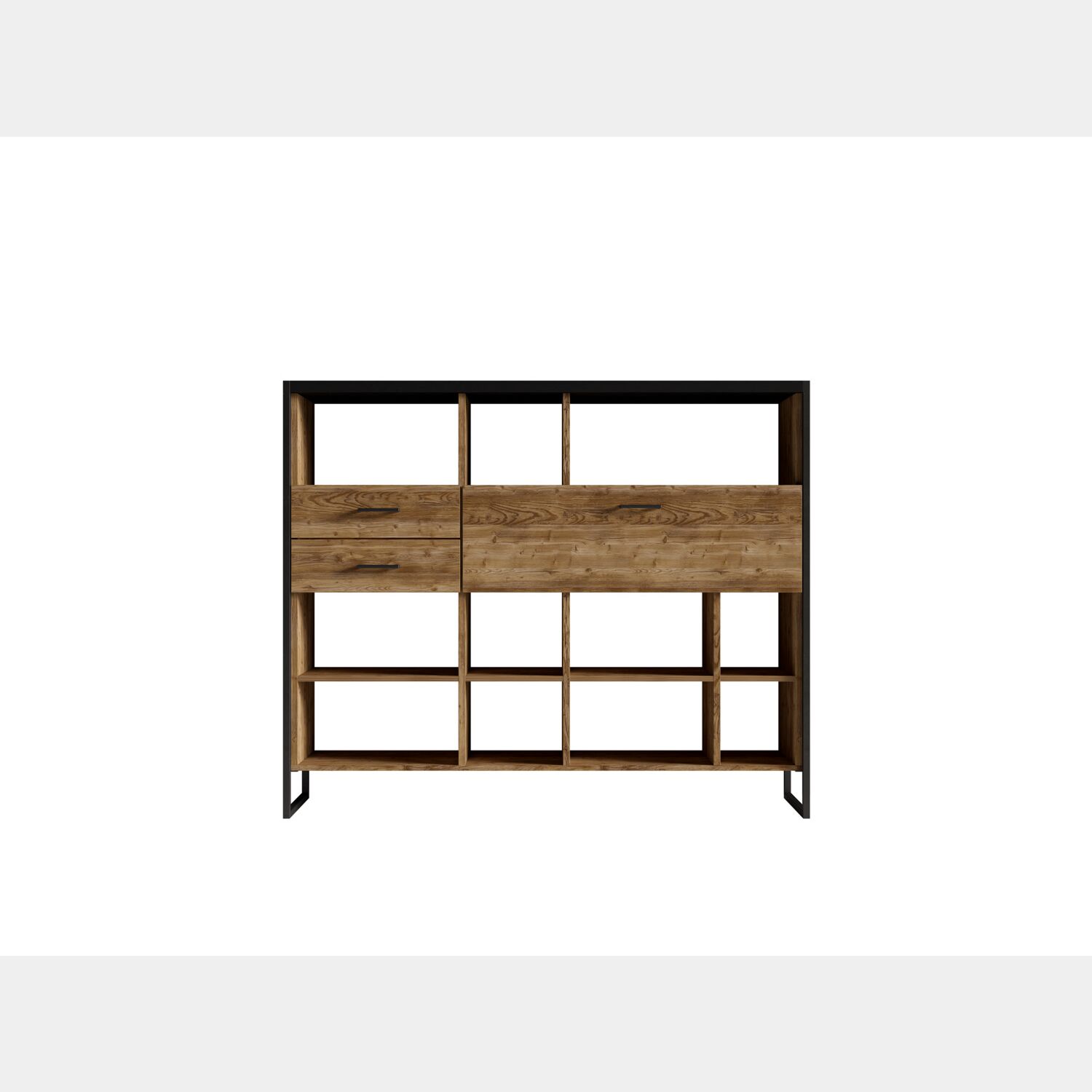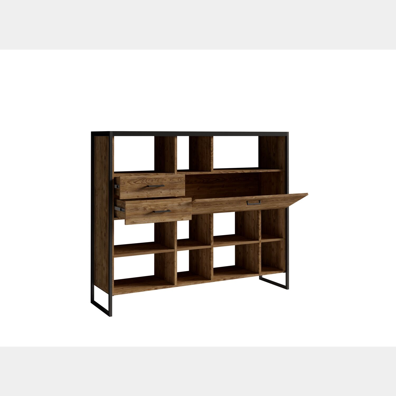 Libreria da zona giorno stile industry composta da : 2 cassetti 1 ribalta, 11 vani a giorno finitura legno invecchiato e metallo nero.