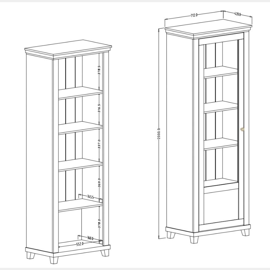 La colonna vetrina è composta da un'anta vetrata con apertura a destra o a sinistra a discrezione del cliente (vedi optional). Internamente è composta da 4 ripiani che permettono di ottimizzare al meglio lo spazio interno della vetrina e tenere in ordine e in esposizione tutti i vostri oggetti preferiti.