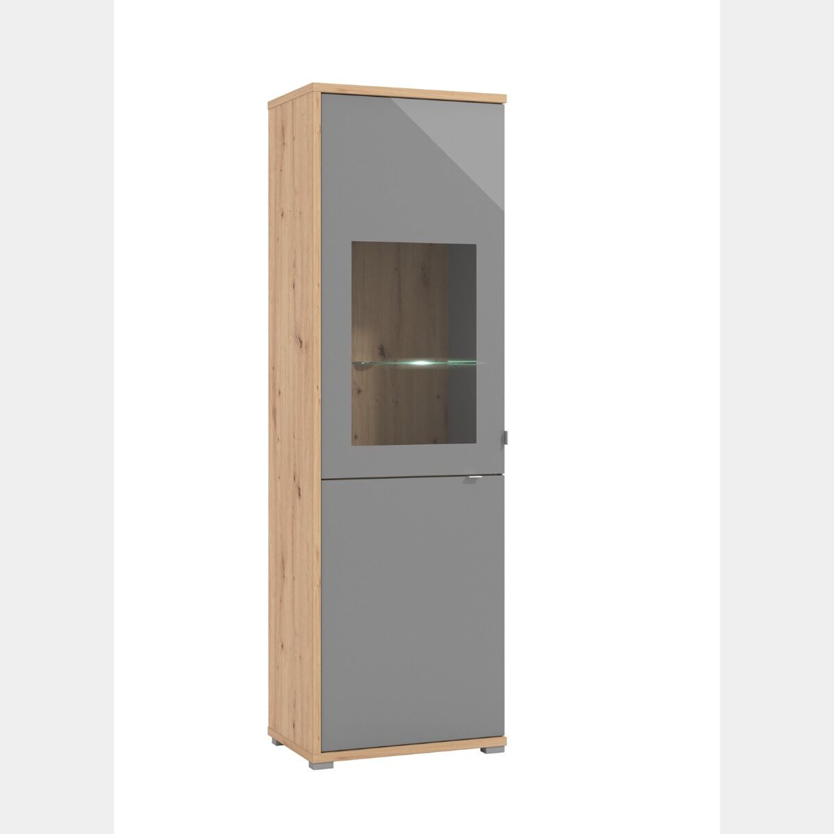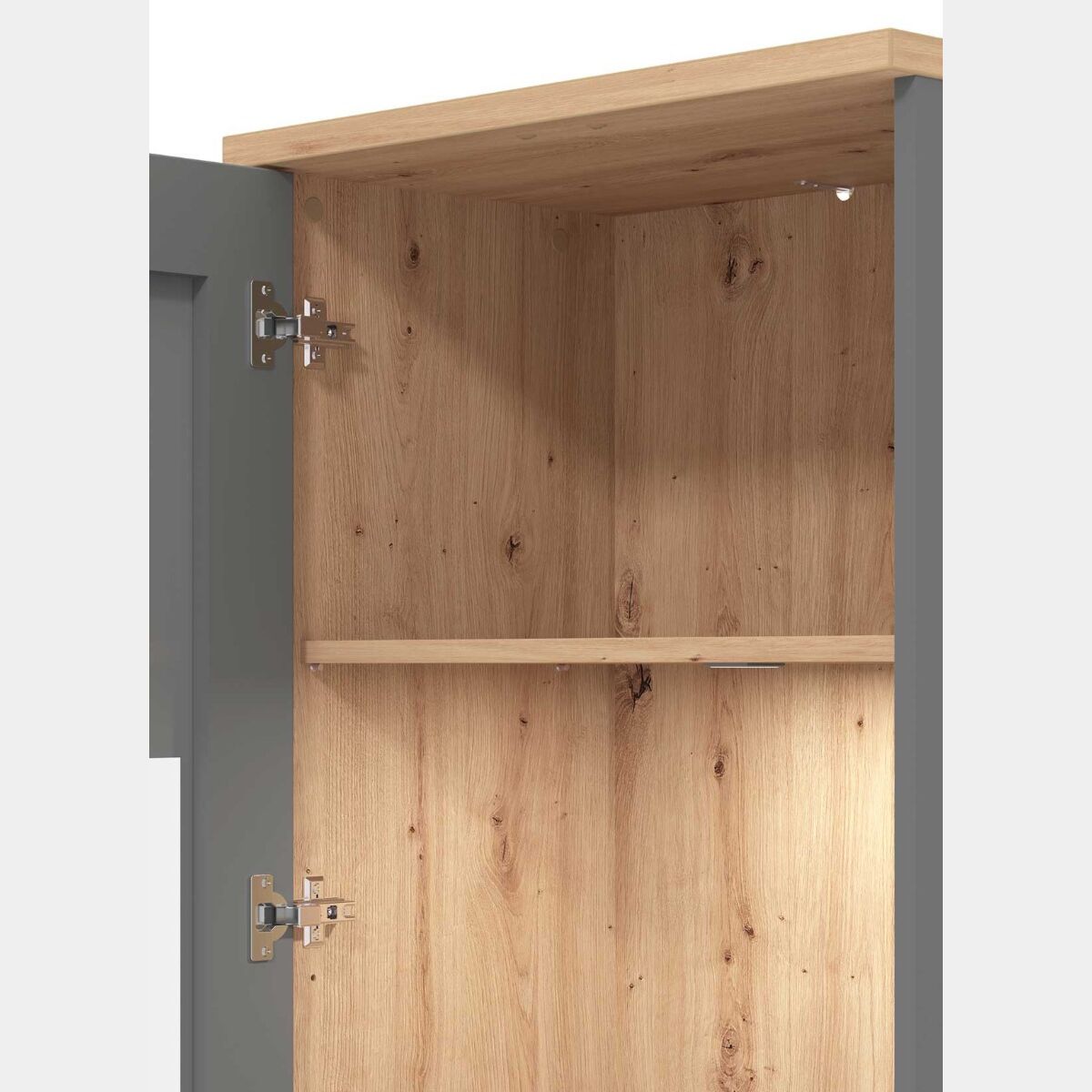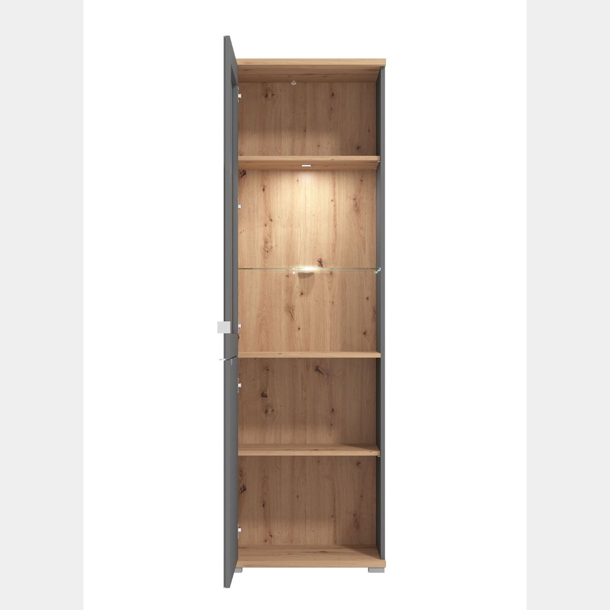 La vetrina è caraterizzata da un design moderno dalle linee geometriche chiare. La combinazione del legno in Rovere, che evoca il calore dell'ambiente, al vetro Grigio grafite rendono la vetrina una scelta ideale per arredare il soggiorno e la sala da pranzo. La vetrina è caraterizzata da uno spazio di archiviazione attentalmente studiato, che soddisfa le esigenze della vita quotidiana.
