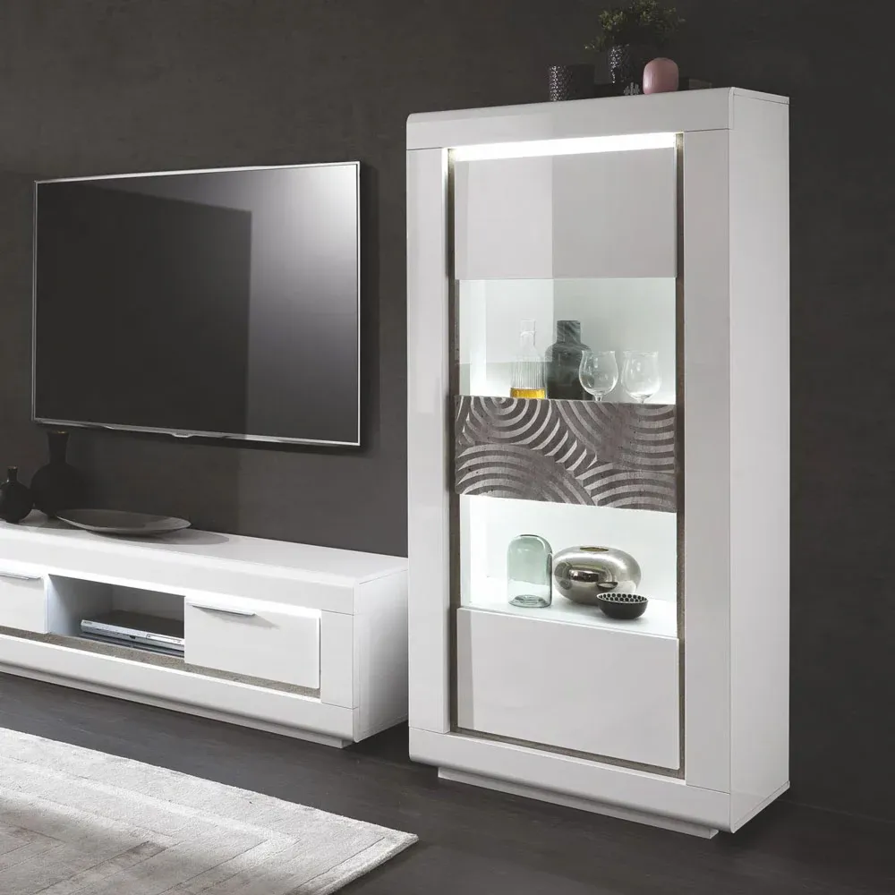 Vetrina colore Bianco lucido e Cemento con un'anta. Si rivela un mobile capiente e moderno.
